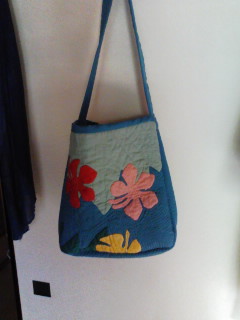 おいらです。 なんとか、形になりました。おいらの初めてのキルトです。 しかしまぁ、難しかった!でも、次につなげられる、いい課題だったなと思っています。 おいら、とても神経質なところがあって、編み物もそうなんですが、手がきついんです。他のことは、大変ザッパーなのに、おかしなもんです。こういうものは、少し針目がゆっくりしてるほうが、作品が伸びやかな気がします。性格が出てますねぇ、神経質でキチキチしてて、チマチマしてる、おいらそのものです。 デザインも、もう少し「ひねり」が欲しいところです。アップリケの段階で大雑把にすると、キルティングのときに、ラインで悩みました。これも次への課題です。エコーキルトも悩みました!キルトって、本当に難しいもんだと思います。 反省点も多い作品ですが、楽しく作れたので、よかったと思ってます。小さいものより大きいものを最初から作ったほうがいいよ、って教えてくれた、ちゃま師匠に感謝してます。時間はかかったけど(てゆうか、さぼってた)、なんかはずみがつきました。 次は、モンステラのバッグをつくる予定です。キルトって楽しい!!