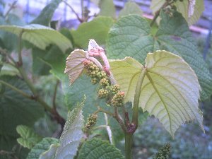胡瓜の接木の部分からカボチャの葉が出てきました根がカボチャなので葉が出で来ても当然ですがこの葉を取らなければなりません一度取ると後は出ませんヤマブドウの実が小さいながら見えてきました少しピンボケになりましたが