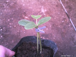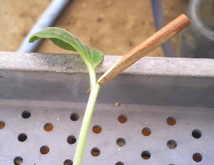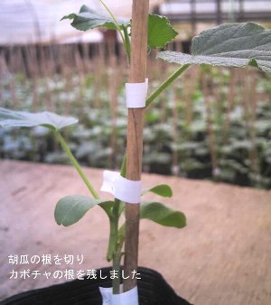 本来は天候のいい日を選んでするんですがなかなか良い天気が無いので今日は曇ってますが接木をしますまずカボチャの葉を一枚だけ残し切り自作の三角に切った棒をグサッと刺します次に胡瓜を首から2センチ位下をカミソリで3分の2切ります切りすぎると失敗しますカボチャに空けた穴へ胡瓜の切り口を入れますコツはカボチャの後ろから胡瓜が出るくらいまで最後のクリップで留めますとりあえずここまで