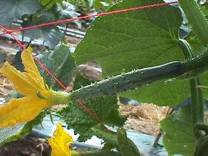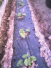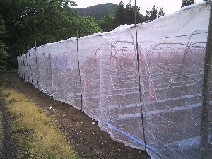 胡瓜は風にとても弱いです風が強いと葉と葉がこすれ傷が付き病気の元になります又胡瓜自体に傷が付き商品にならなくなります「サンサンネット」を畑の周りに張り巡らせその被害を防ぎます少しピンボケになりましたが定植後の胡瓜ですホームセンターなどで売られてるものより小さいです農家の物は収穫が目的ですから苗は小さく育てますホームセンターなどで売られてるのは苗を作るなが目的ですから農家の物は貧弱に見えます