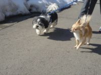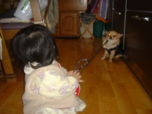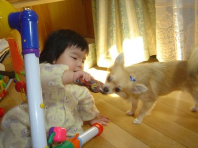 最近・・・??もともと・・・(^^;)朝が苦手なオレンジ☆満月です春のせいでしょうか??春のせいにしてますけど・・・(^^;)起きてもまぶたが重くって、仕事へ行く旦那を見送った後は・・・寝ているメイの隣でバッタン休旦那様~ごめんねぇ~二度寝しないと、何もできないフラフラ状態。そんなんじゃダメだっ!!って思って今日は眠いけどお日様にあたれば目も覚める!!ってクッチのお散歩頑張って行ってみたものの眩しい(>_<)やっぱりダメみたい・・・。まだメイが夜泣きするから、しょうがないよね(--;) そうそう先日☆ご近所犬のチワワのフラン君とクッチ対面しました散歩へ行こうと外に出たらちょうどフラン君家の前にいたんだぁフラン君はクッチよりちょっと大きめでした。犬が苦手のクッチですがやっぱりクッチはチワワなら大丈夫みたいしかもオスがお気に入りかしら??フラン君も少し警戒しながらも、なんだかいい感じにじゃれていましたそして少しだけ一緒にお散歩しました。クッチにお友達ができて嬉しいワンッ