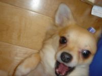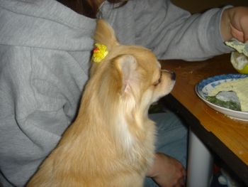 最近クッチがエサを一粒加えては机の下へ持って行き食べてる行動が気になります!!しかも朝あげても夜まで残っている事があって寝る前にやっと全部食べるんです。食欲不振!?でも走り回って至って元気いっぱい!!今日なんてかまって~ってうちの袖引っ張って・・・「ビリッ」ロンTに穴開いちゃうし(>_<)今まではあげたら、速攻☆キレイにお皿まで舐めてたのにな・・・。その割には、うちが食べてたら欲しがるし・・・食欲不振ではなさそうだけどグルメなお口になっちゃったのかしらそれとも少食?? 『ボクもきな粉の付いた草もちが食べたいです!!』うちは今日初めて脱毛しにTBCへ行ってきました!!と言ってもお試しですけど。¥10000引きというやつで。痛かった・・・お試しだから15分間だけだったんだけど永久脱毛だから今日抜いたところはもう生えてこないんだって15分で145本。もっと抜いて欲しかった・・・。物足りぬ!!全部やると30万くらい(毎月一回行って1年半位かかるんだけど)高い(>_<)スグには決断できないけどネイルを通信で始めたばかりで稼ぎのないうちには、とてもじゃないけど・・・旦那には言い出せないわ。もっと安いところ探さなきゃ!!でもTBCさんいわくレーザーやフラッシュだと無痛だけどまた生えてくるから永久はこの位かかるって言ってました。脱毛って自分でやるには限界がありますよね・・・。クッチは、そんな悩みなくていいね(´`)ってか生えて来なかったら逆に慌てるね(>_<)