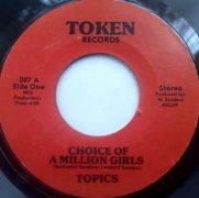 CDのジャケを見るとこのTOKEN皿の写真とともに、甘茶ソウル百科事典P.43「私の甘茶自慢」での高沢仁氏の自慢皿「THE TOPICS WANTED LIVE! BY A MILLION GIRLS (NCS 601)」のジャケも出ている事や曲のタイトルも似ていることからおそらく両者は同一グループと思われます。なお、日本盤も出たTSGのトピックスとは別グループのようです。