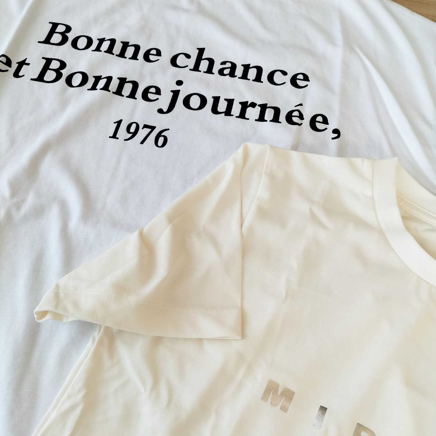 同じ白でも、 ​箔プリントTシャツ​ はアイボリー寄り。