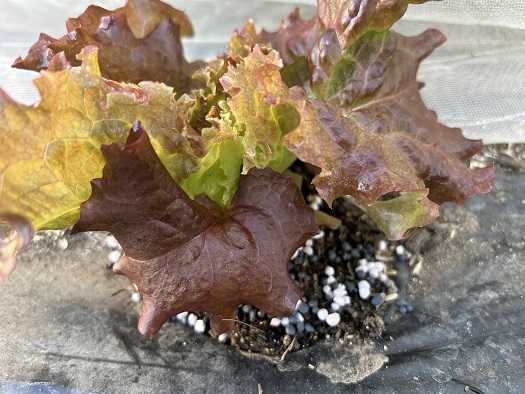 玉レタスとサニーレタスに追肥を行いました。先日、ビニールトンネルにしたことで、どちらも一回り大きくなっています。追肥は、化成肥料を一つまみ。