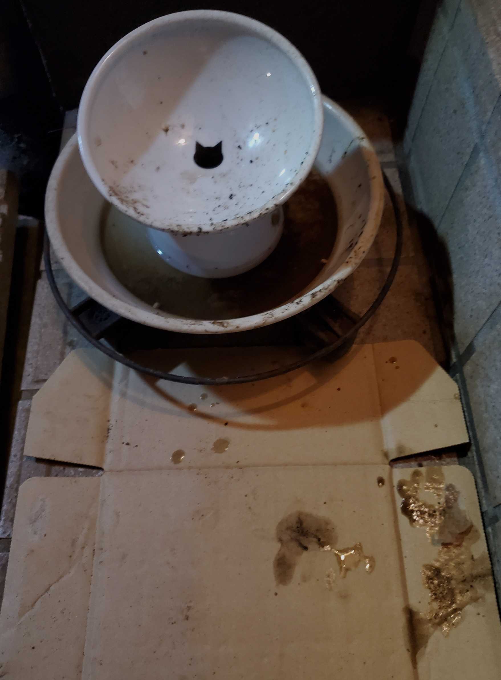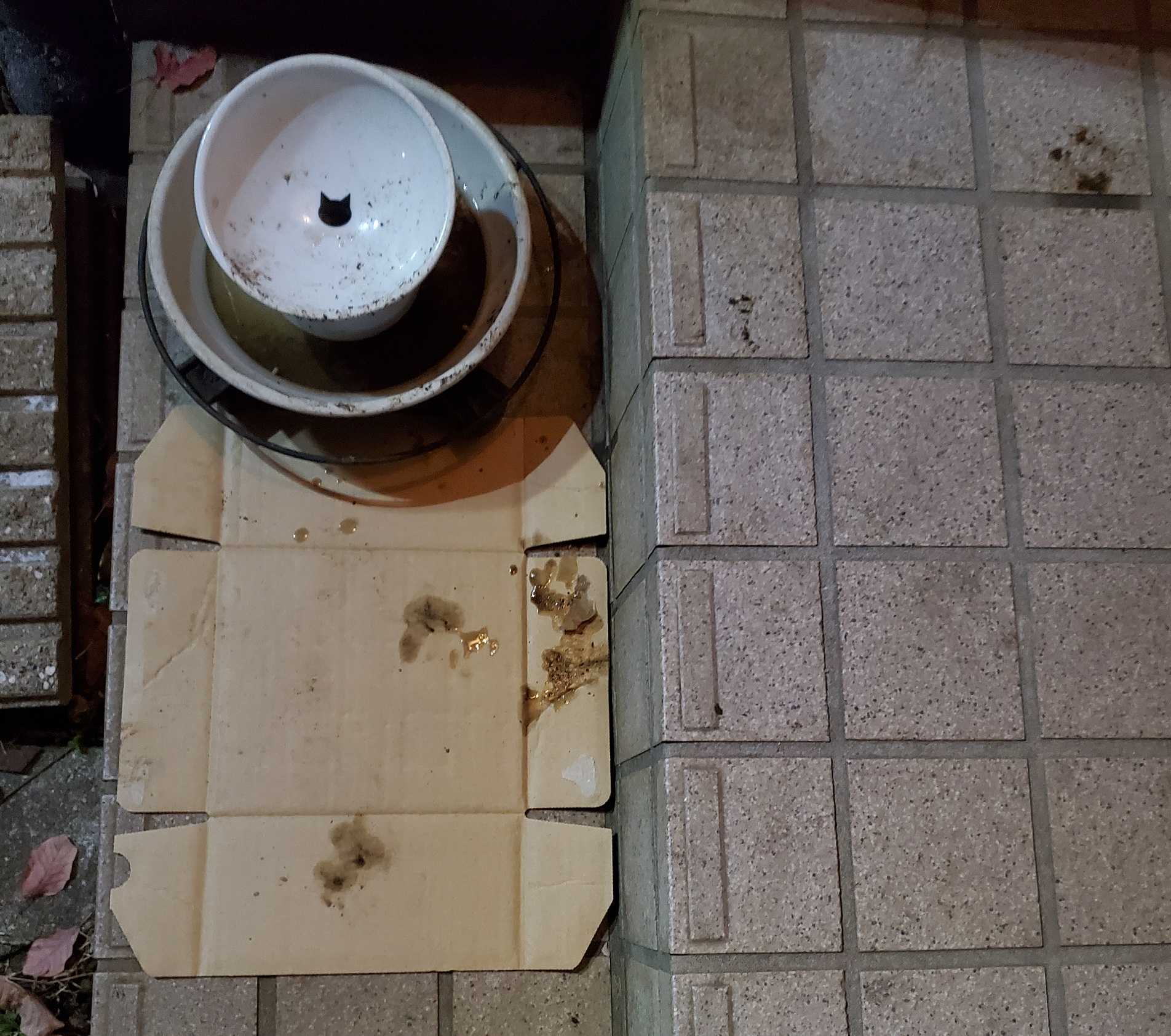 さて寝る前にカメラを見たら、玄関前のカリカリが空っぽだったので、食器を片付ける事に。