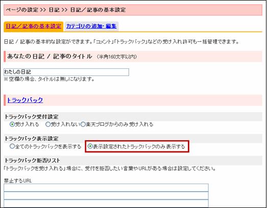 楽天ブログスタッフです。ブログ新機能「トラックバック表示/非表示設定機能」について、リリースいたしました。詳しくはこちらをご覧ください。楽天ブログスタッフです。ブログ新機能追加のお知らせです。日頃、皆様にご利用頂いております、ブログのトラックバック機能ですが、スパム等については「表示したくない」というご意見を多数頂いておりました。そこで、各トラックバックの「表示」「非表示」を設定できる機能を追加することに致しました。7/9(月)のリリース予定となりますので、ぜひご利用下さい!使い方説明:まず、トラックバック表示設定を変更します。ブログ管理→ページ設定→日記トラックバックが送られてきたら、一覧画面から表示したいトラックバックの「表示する」をクリックします。すると、あなたのブログページにトラックバックが表示されます。表示されているトラックバックについては「表示しない」をクリックすると、表示されなくなります。※一括で表示設定することもできます。ブログ管理→日記→トラックバックの表示/非表示・削除ブログの一覧画面にも表示中のトラックバック数と全トラックバック数が表示されます。ブログ管理→日記→編集・削除このように設定することで、ブログページに自分のお気に入りのトラックバックだけを表示することができます。なお、リリース時「トラックバック表示設定」は「●すべて表示する」になっております。ご利用の際は管理画面より設定をお願いいたします。引き続き楽天ブログでは、トラックバックスパム対策もおこなってまいります。楽天ブログを今後とも宜しくお願いいたします。