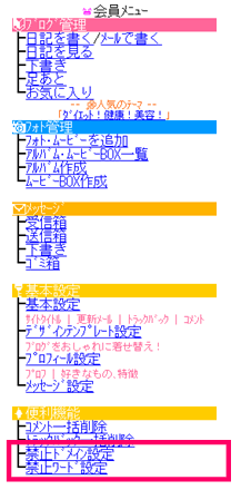 こんにちは、楽天モブログスタッフです。ユーザの皆様にご迷惑をお掛けしているスパム問題への対策として、携帯からもスパム対策が出来るようになりました ドメイン禁止【会員メニュー日記を見る日記詳細】スパムコメントの禁止をクリックして、禁止ドメインに追加してください。特定ユーザーのドメインを指定して書き込み禁止できます。(20件までです) 禁止ワード【会員メニュー禁止ワード】設定したワードを含む、トラックバック、コメント書き込みをはじくことが出来ます。 引き続きスパム対策を実施してまいりますので、今後ともどうぞよろしくお願いいたします。