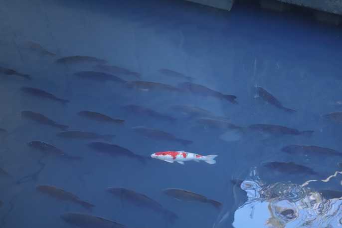 いつものところに 錦鯉・・ひときわ目立ちます・・家来に守られた 大名行列のようです。(笑)