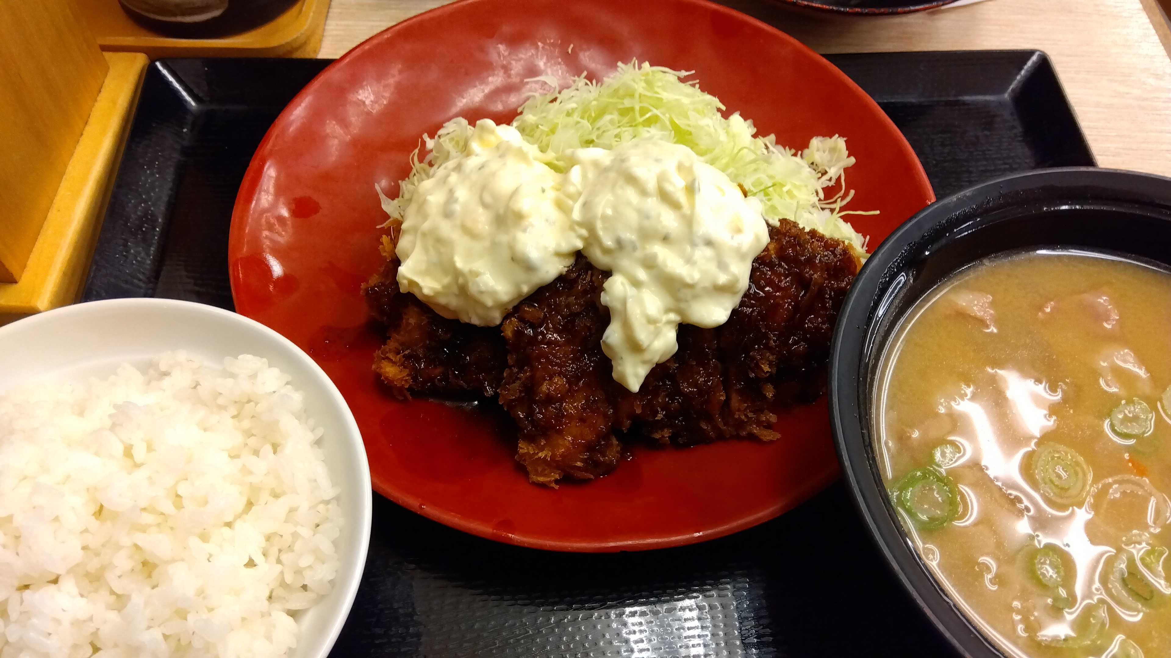 かつやで、タルタルチキンカツ定食を、とん汁(大)にして。