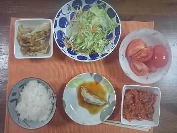 「昨日の晩ご飯」は餃子がメインで他には、トマト、マグロの中落、キャベツと人参の千切りにレタスのサラダ、などでした。