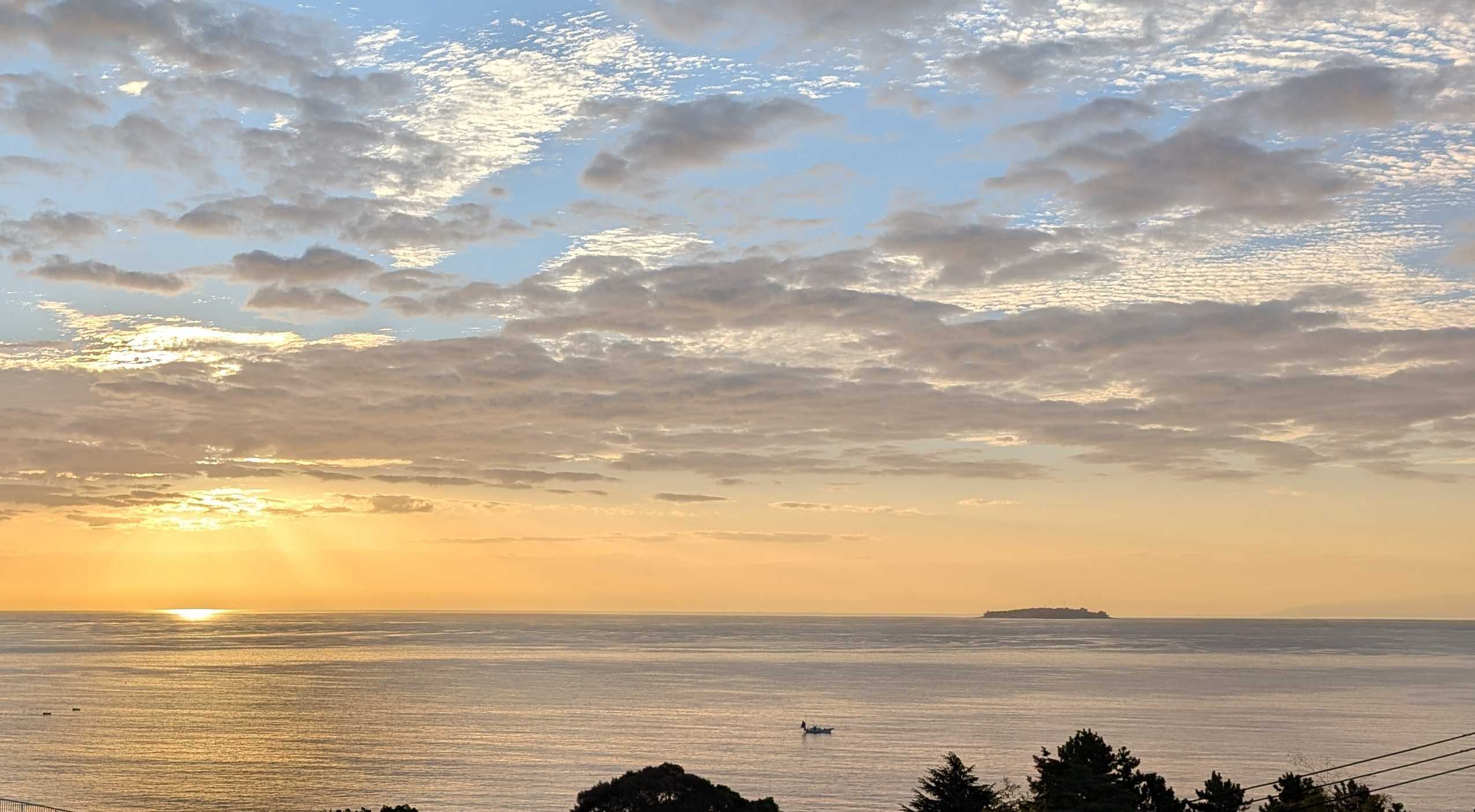 今朝の日の出直前の熱海の海と空です。お昼過ぎましたがまだ雨は降ってきません。今朝は急いで病院に行って湿布薬を貰ってきました。寒くなると痛いとこだらけです。昨日、TVで防衛費の財源に“金融所得課税”を上げれば良いと国会議員が言ってました。NISAがあるので一般の人には影響はない!何億もの投資をしている富裕層への増税だ!そうです。でも、最近の貯金通帳を見ると以前よりも利息が多くつくようになってきています。これにも金融所得課税が引かれているんですよね。あたしの郵便貯金も以前の利息は〇円レベルでしたが、今は3桁になっています。庶民のささやかな預貯金にも金融所得課税は影響します。そういえば、SNSで「早苗バッグ」が話題になっているそうですね。グレースディライトトートバッグといって値段は13万6400円だそうです。皇室御用達の会社で注文が集中していて現在高市モデルは5カ月待ちだそうです。ささやかな利息をどうこう言ってるあたしにはとても高価で買えませんよ。