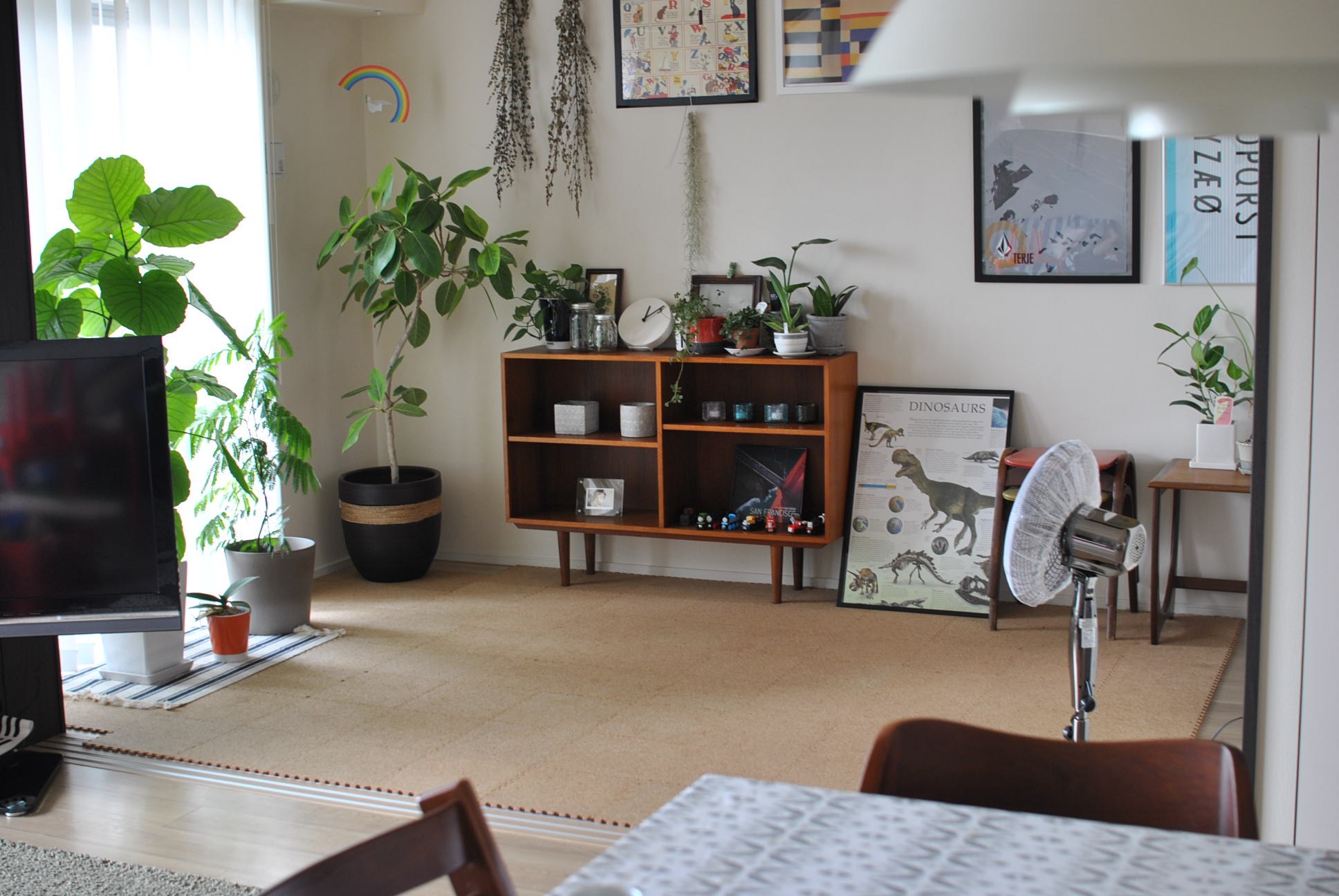 リビング隣の洋室は、引戸を全て取り払い、リビングの延長として、子供の遊びスペースとして、使用しています。北欧ヴィンテージの本棚(飾り棚)を置くようにしてからは、子供のおもちゃは将来の子供部屋やリビング収納に移動させました。おもちゃがない状態はこんな感じ。グリーンをたくさん飾って、ボタニカルルームのような雰囲気を目指しています。おもちゃがある状態。 必要な時に遊びたいおもちゃを運んでくるシステムは、そんなに大した手間ではないことが実感できました。その方が、スッキリ片付く! 子供の遊びスペースでも、あえて子供っぽくはせずに、オシャレな雰囲気にしたいなーというのが、私の理想です。 とは言え、普段はおもちゃがそのまま放置されっぱなしで、とてもお見せできるような状態ではありません。。(;´д`) そして、 ジョイントマットはいつになったら、外せるのでしょう。。 にほんブログ村