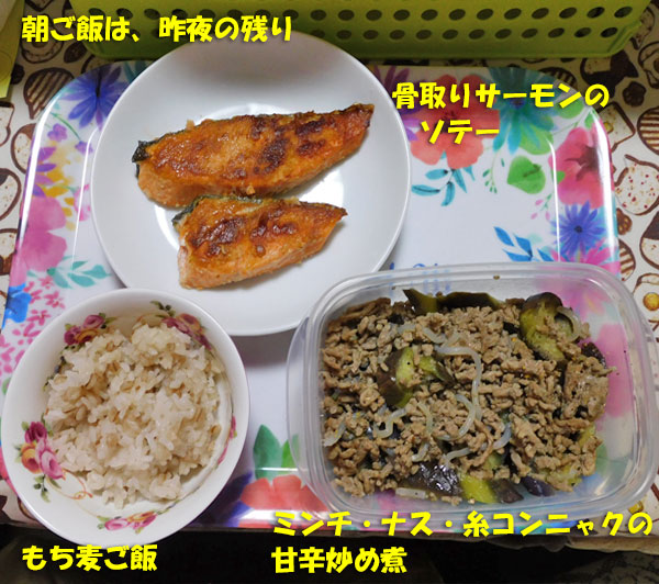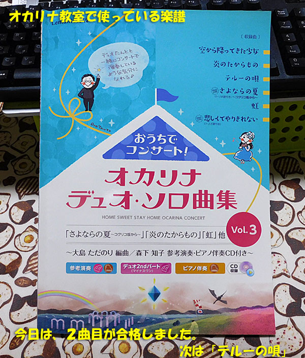 今日は、9時に家を出て、オカリナ教室に向かいました。今日は一日中、小雨か曇りの予定だから、家に帰ってきてから庭仕事をするつもり。今日は、メンバーの一人が法事のためお休み。少なくて、寂しかった。私たちが練習している曲集は、これです。本についている順番にやっていますので、次回は、「テルーの唄」ということになります。その次が「さよならの夏」そして、私は知らないけど、ドラえもんの映画の曲らしい。「虹」こんな忙しい曲は、オカリナの音色に合わない気がするんだけど。で、曲集の最後は、「悲しくてやりきれない」これは知っていますよ。オカリナの優しい音色には、「浜辺の歌」とか「里の秋」とかの、少しゆっくりした、優しいメロディーが似合うと思うんだけどな・・・今日は、持っていったバスCのオカリナも使いました。他の人たちが高い音で演奏しているから、どうかなぁ、と思ったけれど、録音して聴いてみたら、まあまあ良い雰囲気でした。もう一人、バスCを演奏する人がいたらいいのにな。でも、高いからね、買って、とは言えません。今後の予定を見ると、アルトのF管を使う曲がありました。普通使っているC管よりも、低い音の出る楽器です。楽譜がF管用で書かれているので、バスCで演奏しようとしたら、移調しないといけません。そのまま、脳内変換で演奏するのは大変だから、移調した楽譜を書くのが早いかも。それか、アルトのF管を購入するか。うーむ、どうしよう。まあ、今日は「炎のたからもの」を気分よく演奏できたので良かった。次回は、来月の第二火曜日だから、それまで考えましょう。オカリナ教室の帰りには、業務スーパーに寄りました。そしたらね、入り口近くに、ナスの8本入りが298円で積まれていたので、急に食べたくなって、購入しました。で、作ったのが、このナスの塩もみ、おかか胡麻和えと、豚肉との味噌炒め煮。最近は、油をほとんど使わなくなりました。揚げ焼きとか、ソテーにするときくらいですね。ノンフライヤーで焼くものは、基本、油をつかいません。お肉は、少量の水を入れて、沸騰してから入れると、普通に炒めることができます。次男坊が、以前はゴーヤが苦手だったので、みりんで、先にゴーヤを炒めてから、他の食材を入れて炒めると、苦味がほとんどなくなって、食べてくれました。みりんだけで炒めたときに、焦げたことがあるので、だんだんと水で炒めるようになった、というわけです。するとね、NHKの番組でも取り上げられていたみたいですね。 NHKみんなのきょうの料理「野菜と豚肉の水炒めレシピ」たしか、以前、ごねあさんも紹介されていたみたいです。炒め煮とかは、どうせ後から水分を入れるわけだから、最初から水を使っても、大丈夫。水が多すぎても、しばらく煮詰めていたら、減るし・・・実は、今日、ももいろハートの切り戻し剪定をやったのですよ。切ってみたら、中の方に、枯れかけた茎とか枯れた葉があったので、それをきちんと取り除きました。切り取った先の方は、もったいないけど、挿し芽に作って、どんどん挿しています。剪定後の写真を撮りましたが、ちょっと可哀そうな感じなので、また新芽が出て、見かけがよくなったら、写真をのせますね。ひとまず、報告だけです。