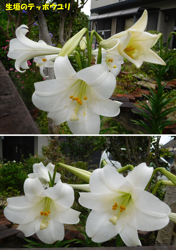 天気予報では、今日も朝から土砂降りのはずだったのに、おきてみれば、確かに地面は濡れているけれど、くもり空。傘なしで庭に出られました。玄関ポーチのビスタミニの花ガラを取りのぞいてから、庭に出ましたよ。そして、いろいろと、鉢の場所を変えてみました。山紫陽花「土佐緑風」の花が裏返ってしまったので、奥に引っ込めて、代わりに、濃赤のユリの鉢を置いてみました。くれないは、花が裏返る途中ですね。株がだいぶ大きくなったので、来年は、もっと花数が増えることでしょう。楽しみです。道路で、上の家の奥さんと話しているときに、この斑入り葉ランタナを見せたくなって、フェンス横に移しました。上の家の奥さんは、ブロック塀に生えているのに、名前を知らなかったみたい。ランタナと言う名前で、いろんな色の花があるし、斑入りの葉のもあるんですよ、と言って持ってきて見せたんです。今、居間でブログを書いていたら、道路を歩いている人が、この斑入り葉ランタナの鉢や紫陽花、赤のユリなどをじっくり見ながら歩いていらっしゃるのが、わかりました。なんか、嬉しいです。生垣の紫陽花も、ますますいい色だから、通る人の楽しみになっているみたい。道路側から見ると、アリランは、こんな感じ。アリランの横に植えた赤葉紅花トキワマンサクが、もう終わったと思っていたのに、また少しずつ咲いています。この春に植えたばかりなのに、まあまあ花をつけてくれたので、嬉しかったです。来年は、どんな感じになるのかな?では、昨日の晩ご飯ね。昨日は、オカリナの帰りに業務スーパーに寄って、牛肉と白の糸コンニャクを買ってきました。でっかい白菜を切るまえに、チタン包丁を研ぎました。せっかくだから、1個まるごと、全部煮ましたよ。先に、お肉だけ炒め煮にして、味をつけ、お皿に取り出しています。白菜が煮えてきたら、どかしていた肉をのせて、ひと煮立ちで出来上がり。すき焼き風煮込みにするときは、たいてい厚揚げを入れているけれど、今回はなかったので、最後に、味付けのいなり揚げを載せてみました。これは、美味しかった。残りを朝ごはんで頂いたのですが、このお揚げと、ぴったり!!甘辛い味付けだからね。最後に、昨日嬉しかったことね。夕食の後、片づけをしていたら、長男が、「トイレの戸を、修理しとったけん。」と言います。最近、動かすのがとても大変だったのです。シリコンスプレーとかをしても、たいして変わらず、周りに飛び散ったしぶきのせいで、滑りそうになってた・・長男が言うには、引き戸の戸車が下がっていたから、しっかりつけなおしたらしい。おかげで、するすると開け閉めできるようになりました。頼んだわけではなく、いつの間にかやっておいてくれたので、さらに嬉しかった!!1階は、とにかくすべて引き戸。車いすになっても、出入りしやすいように、という考えでした。母がよろよろになって、歩行器を使ったときにもこの引き戸のおかげで、部屋から部屋へ移動するのが楽でしたよ。父のためにやっていたバリアフリーの配慮が、母に役立ち、今度は、私が、利用させてもらっています。引き戸以外にも、家じゅうに手すりがあるのが、とても助かっています。