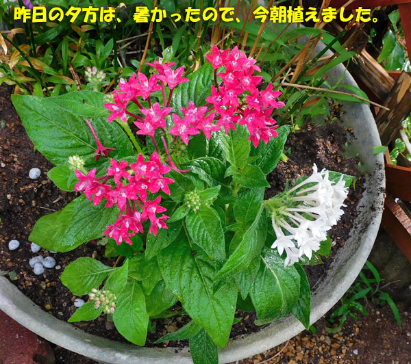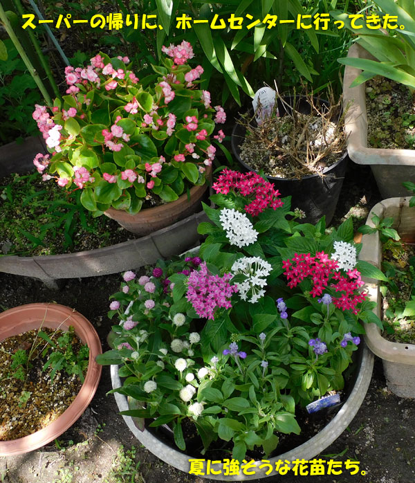 昨日の夕方に植えようかと思っていたけれど、なんか、まだまだ暑そうだったので、今朝涼しいうちに植えましたよ。これは、屋根の下の大きな鉢に植えたペンタスもう一つの苗は、移動できるサイズの鉢に植えました。赤の色がきれいなので、玄関ポーチとか、生垣のそばとか・・・2色セットの苗を、3ポット買ってきました。つぼみがいっぱいです。ブルーサルビアは、あまり横に広がらないと言っていたので、ここに植えています。色が、とっても涼しそう。千日紅は、春先までビオラを植えていた場所に植えました。これ、うんと広がるのかなぁ。赤い花の苗は、全部このくらいのコンパクトサイズでした。さっき見たら、さっそくモンシロチョウがやってきて、千日紅の花にとまっていました。蜜がいっぱい、あるのかな?これは、花鉢コーナーで、一番迫力があるスーパーゼラニウム・チャンピオン。二、三日で花が乱れてきますけれど、次々につぼみが上がって、花が開くので、途切れることがありません。このチャンピオンほど大きな花ではありませんが、ランタナ・レッドローズは、株の大きさが一番。昨年は、私の顔近くまで伸びて、まわりのミニバラにもかぶさっていました。何度も、剪定したのですよ。今年は、まだ、そこまで大きくなっていませんが、真夏の女王様になる日は近い??では、最後に、昨日の晩ご飯。うどんのゆで麺3個セットを買っていたので、使いました。普通に茹でたあと、ざるにとって、水洗いしてぬめりをとります。そして、めんつゆをからませて、下味OK朝買っていたおやつコロッケをノンフライヤーで焼き、出来立てのコーンポタージュを添えました。朝ご飯にも、豚肉の生姜焼きとコロッケ。冷奴には、また、胡麻ドレッシングをかけて頂きました。美味し~いバナナの残りのうち、2本を使って、炊飯器バナナケーキを作りました。今日の昼ご飯になる予定です。