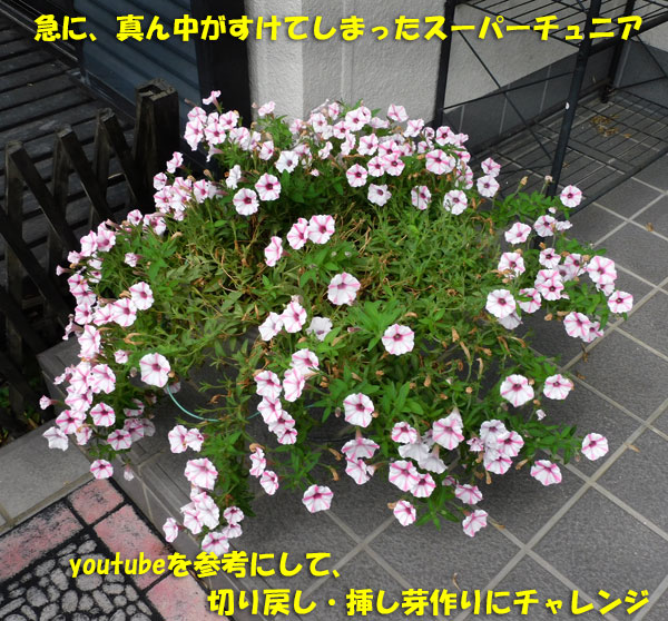 今日は、朝から切り戻しをやってみました。樹木の剪定だったら、バッサリと切れるのに、なぜか、鉢植えのペチュニア系のお花には、なかなか手が出せません。でもねー、玄関ポーチのスーパーチュニアが、急に真ん中があいてしまい、これは、やっぱり、なんとかしないといけないね、と、思い切ってやることにしましたよ。動画で見ると、ほとんどが、切った枝先はそのまま捨てているみたいだったけど、それを挿し芽にして、植えてある動画もあったので、私も、挿し芽にすることにしました。幸い、何年か前に買っていた「種まき・さし芽の土」があったので、それを使いました。動画の一つでは、切り戻しに使うハサミや手袋などは消毒しましょう、と言っているのがあったけど、それはやらなかった。鉢の縁から2cmくらいの場所を目安にして、とにかく、花芽が残らないように切り取ること、そして、中心部分をよく見て、枯れている枝とか葉を取り除き、大きな葉も取り除いて・・・とやっていたら、あら、やりすぎたかな?切り取った枝先から、なるべく太いのを選んで、挿し芽にしました。しばらく水につけたあとで、挿し芽用の土に植えました。ここは、直射日光のあたらない、明るい日陰です。1~2週間は、土を乾かさないように、腰水をしたほうがいい、とも言っていたから、洗面器に入れています。挿し芽が成功したら、今度はどこに植えるか、準備しておかないといけませんね。チャンピオンの後ろに写っているのは「ももいろハート」なんだかね、ものすごーく可愛いから、切るのが可哀そうで。と思ったら、こんな動画がありました。 youtubeより「ももいろハート切戻し」梅雨前剪定やっぱり、あとのことを考えたら、梅雨前(もう梅雨だけど!)にきちんと剪定しておいた方がいいのよねー。明日、やるかな?でも、挿し芽用の土がもうないので、買ってこなくちゃですね。今日は、コーラスの練習日だったので、挿し芽作業を終わらせてから、シャワーを浴びて、準備して、練習に行ってきました。少し早めについたので、公民館の駐車場で写真を撮りました。この公民館では、毎年「藍染体験教室」が開かれているので、毎年「藍」を栽培されています。こんな花。コーラスでは、今日は四曲、しっかりと歌いましたよ。そうそう、今日は、また84歳の方からお土産を頂いたんです。春からだけでも、何回旅行に行かれているかしら。みんなが凄いですねー、と言っていたら、「自分で稼いだお金やけん、使わなもったいない。」と、言われていました。今でも、自宅が事務所なので、仕事を手伝っているそうですよ。家族の食事の支度も、朝・昼・晩すべて作ってらっしゃるし、凄すぎる~。ご主人は亡くなっていて、息子さんの代になっているけれど、家族の一員として、がんばっていらっしゃるみたいです。こんな凄い先輩がいたら、私もがんばろう、という気持ちになります。最後に、玄関の横にいたカマキリ君。たぶん、6cmくらいになっていたと思います。左側の後ろ脚が見えませんが、戦いのときに取れたのでしょうか。しっかり生き延びて、うちの庭のいけない虫たちを食べてくださいね。