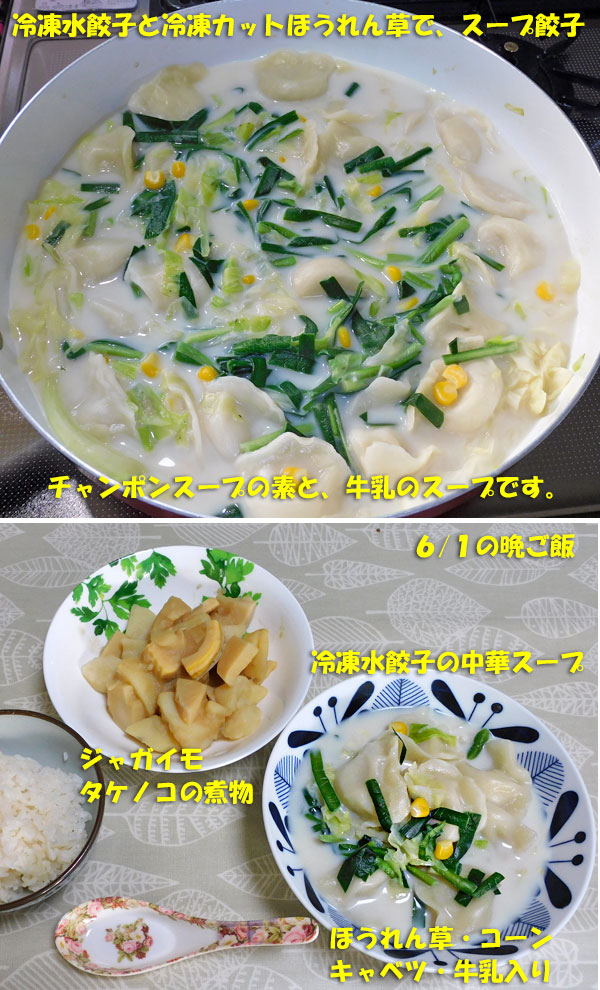 今日は、朝6時過ぎから、気になっていた生垣の剪定をしました。春に一度きれいにしていたのだけど、その後、また新しく葉っぱが伸びてきて、ぼさぼさになっていたんです。電動バリカンの縦長タイプも使って、生垣の上を揃えました。といっても、庭師さんのように、まっすぐに切りそろえたわけではなく、出っ張った分を、切り取った、という感じです。八重桜だけは、樹高が高いので、何もしていませんが、道路から見える、やぶ椿、白玉椿、甘夏などの剪定は終わっています。生垣の紫陽花は、だいぶ青くなってきましたが、まだまだこれから。これは、道路から見た、玄関前あたり。ピンクの四季咲きのミニバラが、元気です。門の外の植え込みの赤いチェリーセージも、だいぶ花数が増えました。いつも開けっ放しにしている門を入ってくると、匂い梅花ウツギが、最後のがんばりを見せています。そして、玄関ポーチに置いたスーパーチュニア・ビスタミニも、鉢の幅の倍くらいに、花を広げています。あ、忘れちゃいけない、山紫陽花「くれない」それと、気になっていたチリアヤメの実を、ついに刈り取りました。もうずいぶんと、実が熟して枯れてきて、種をばらまく準備OK。梅雨の雨でそのタネが流れ出すと、雨水の通り道に、またたくさんのチリアヤメが根付いて、花を咲かせるんです。ほとんど流されて、下水に交じってどこかへ行くのだと思いますが、雨水枡の周りには、たくさんのチリアヤメ。タネの発芽率は、案外低いのかもしれません。1つの実が100個くらいのタネをまいている割には、庭すべてが、チリアヤメに埋め尽くされているわけではないですから。それが、救いかも。今日まとめたゴミ袋には、大量のチリアヤメの実が入っていますよ。では、昨日の昼ご飯から。豚ミンチを、甘辛く、生姜風味で炒めたものを、混ぜご飯に入れています。とーっても美味しかった。そして、夜は、そろそろいいかも、と思って、冷凍していたタケノコを使った晩ご飯にしました。混ぜご飯のおにぎりは、今日の私の朝ご飯まで。あく抜きのあと、砂糖をまぶして冷凍していたタケノコは、ジャガイモと一緒にだしつゆで煮込みましたが、これまた、とっても美味しくて、よかったです。今年のタケノコは、これですべて、終わりです。また来年ね。これからは、多すぎたときには、砂糖をまぶして冷凍することにします。最後に、昨日の旦那のカヌー体験教室のこと。私が、広報誌でその募集記事を見つけたのが28日。旦那に教えたら、すぐにネットで申し込みをして、昨日、5月30日が体験教室の当日でした。なんか、とってもグッドタイミング。行ってみたら、旦那の他には、若い夫婦がいて、3人だけだったそうです。それに対して、指導者が4人。全くの初心者の若夫婦に、それぞれ二人ずつ指導者がついて、旦那は「行っていいですよ~」と言われて、一人で自由行動できたらしい。自分のパドル(櫂)を持っていっていたので、すぐに、経験者だとわかったのですね。おかげで、とっても楽しく過ごすことができたらしい。そのダムは、カヤックを楽しもうとしても、船を下ろす場所がない。唯一おろせる場所は、昨日開催した団体のものなので、会員になる、とか、申し込む、とか何かしないと使えない場所らしい。それを、2000円の参加料だけで、思う存分楽しめたので、本当に良かったみたい。旦那から、いっぱいお礼を言われました。よかった!!