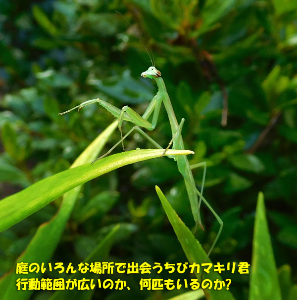 今日は、コーラスに行く日だったので、朝の庭仕事は、水やりだけ。そのあと、写真を撮りました。あ、でも、ブルーベリーの実は、ちゃんと集めましたよ。 実欲しさに 毎朝何度もスクワット ブルーベリーは 今年も豊作ブルーベリーの実は、葉の陰になって見えないことがあるので、何度もかがんで、下から見上げないといけません。ま、それも楽しいのですけど。最近、このサイズのカマキリ君を、庭のあちこちで見かけます。けっこう行動範囲が広いのか、それとも、以前私が拾ったカマキリの卵嚢から生まれた兄弟なのか、見分けがつかないのでわかりませんけど、カマキリ君がいっぱいいるなら、ありがたい。頑張ってね。桔梗が咲きました。昨日の夕方見つけていたのですが、今朝は花が二つになっていましたよ。桔梗の花が開くのは、三段階で、まずは、花びらだけが開き、次に雄しべが開きます。その後、今度は中央のめしべが、星の形に開きます。これも、雄性先熟の植物ですね。千日紅のめしべが、突き出しているかもしれない、と思って、がんばって撮りましたが、わからないまま。あとで調べたら、めしべはおしべよりも短い、と書いてあったので、見えないのかもしれません。白の千日紅の花の中で、色が変わりかけたものがありました。千日紅のタネの採り方の記事を見つけました。この方法なら、簡単にできそうです。昨日の朝ごはんに食べたバナナの残りで、久しぶりにケーキを焼きました。くるみゆべしを作っていた時の、クルミの残りもいっぱいあるからね。ホットケーキミックス150グラムに、牛乳100ml、卵一個底に並べたバナナ1本、切って交ぜたバナナ1本。それに、クルミとレーズンを入れています。晩御飯のデザートにしましたよ。今日のコーラスは、先生抜きで、音取りの練習。「うたうたう」は、アルトパートがとっても変なメロディラインですが、特訓の甲斐あって、スムーズに歌えるようになっています。いつもなら、練習の帰りにスーパーに寄るのですが、あまりにも暑いので、直帰しました。もう、外に出る気になりません。最後に、以前書いた絵ね。もうひとつ。千日紅の絵と、葛の絵は、お気に入りなので、この頃からずっと、二階のトイレの壁に飾ってあります。
