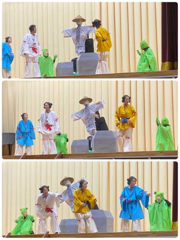 小学校の山椿の集いで高学年と一緒に坪内逍遙作「すくなびこな」を観る