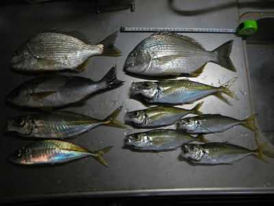 写真は今回の私と弟の釣果で、右が弟で、ヘダイ一枚にアジ5匹、左が私でヘダイ一枚に30cmアジとイサキ4枚です。現地にAm2:00に着くと釣り場は開いていて安全ですが、濁りとウネリが強く夜釣りの期待が持てません。濁りが強いために明るい内の真鯛狙いに集中し、コマセワークを信じて(大笑い)弟とカゴを投げるもウキは微動だにせず。日没後の明かりが残るうちに弟のウキが消し込みヒットし、引きが強くたも網を私が用意すると、手前に浮いてきた魚影は青物のイナダ、弟が魚を浮かせ私がタモを入れる瞬間に3号ハリス切れバラシ。私の過去の経験から、カゴ仕掛け3号竿/3号~3.5号ハリスの限界は黒鯛メジナの等の2K前後迄でがギリギリで、それ以上の獲物はハリス切れとなり運が良くなければ取れない。凡ちゃんが、またまた記録更新の真鯛ゲットしたらしく、今年の秋から冬礒に大いに北が膨らみます。