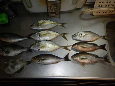 義弟が左写真で、シマアジ3枚、イサキ2枚、カイズ一枚、カワハギ1枚、私は右写真で、シマアジ1枚、イサキ3枚でしたがイサキ一匹はスカリのファスナーが少し開いていて逃げられました。