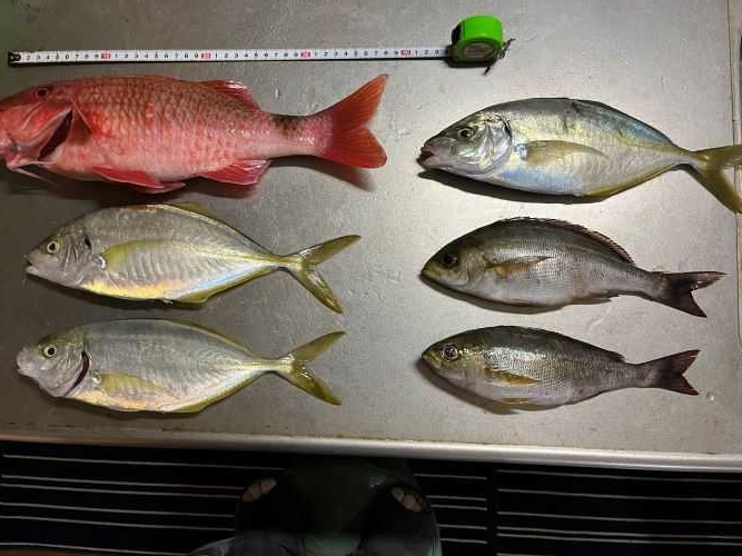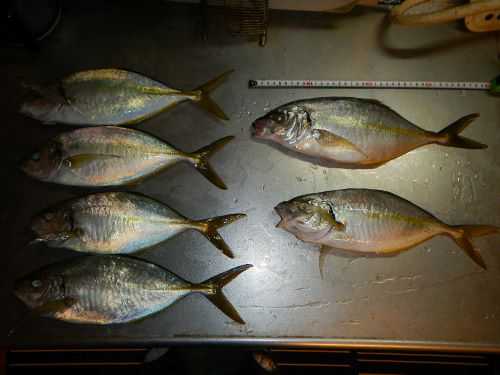 義弟と二人での釣果、左が義弟の36㎝前後のシマアジ4枚、右が私の39㎝と36㎝のシマアジ2枚。現地に着くと、潮の流れはあり海況は良く釣れそうな気配です。日没前の4時半過ぎからカゴの試し投げを始めると、5時過ぎにウキガ消し込みシマアジらしき引き味で、シマアジの姿を見て含めてバラシ3連発....。バラシ専科の私と違い、義弟を見るとコンスタントにシマアジをヒットしています。私は今回も釣りべた三昧で坊主で終了かと頭をよぎりましたが、シマアジがヒットしている時間帯に何とか一枚でも獲りたいと、食い気が立っているポイントへ集中してカゴを投入し、何とか39㎝のシマアジ筆頭に2匹ゲットできました。遠方で雷鳴がとどろきイナヅマが走る中、釣り場の海況は良し、日没前にシマアジヒットもあり、夜釣り本番時間帯の5目釣りに期待でしたが、私と義弟二人共に期待の夜釣り本番タイムに当たりが全くなし。通常ならPm10:00頃までは粘りますが、今回の夜釣り本番タイムはまったく釣れる気がしなく、本日はシマアジゲットで納得として、次回に鋭気を残した方が得策とPm8:30分で早上がりとしました。