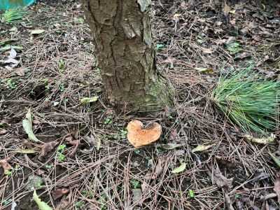 昨日の事、庭の松の木の周りを見ると、なんと!、初茸が2個生えていました。13年ほど前に松の木の下に初茸が10個ほど出たことがあり、その数年後に2個出て、その後は初茸の発生はありませんでした。私の素人趣味で、以前からあった松の木の松かさから生えた実生松を育てて数本植えてあり、趣味の庭木松としてと、もう一つの目的は初茸の発生へのかすかな期待です。今回の初茸は当初の期待通り、そこそこに育った数本の実生松の根元に生えていました。来年度も初茸が生えるか...、期待が膨らみます。楽しみですね。