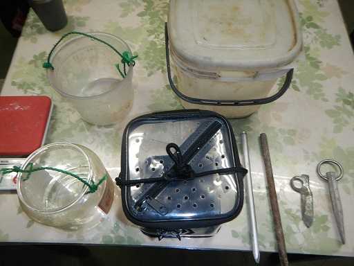 体力のなくなってきた高齢者には、カゴ夜釣りの帰りの上り階段等で背負子の重量が厳しくなってきました。そんな理由にて本日は釣り道具の軽量化に挑戦です。写真右上が今まで持ち込んでいたコマセバケツ440g、右下が持ち込み用軽量コマセバケツ230g。写真左上が今までのチャランボ用コマセバケツ180g、左下がチャランボ用軽量化コマセバケツ68g。チャランボ固定用鉄製ピトン右238g、ピトン左が軽量アルミピトン68g。スカリ固定ピトン右152g、左の薄型ピトン47g。今まで使用の上記合計1010g、軽量化合計413g、差し引き軽量化合計597gとなりました。写真の≒30㎝の血抜き前のイサキが305gですから、≒30cmのイサキ2匹分の軽量化です。