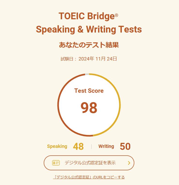 今年の春にメルマガで「無料モニター受験」の募集を知って「11月なら受けれるかな~」と申し込んでいたTOEIC Bridge(初級者向け)S&Wテスト(スピーキング&ライティング)に当選して、受験してきた結果が出ました。実は、この試験日は、和歌山へ旅行しているハズでしたがせっかく無料のTOEICに当たったんだし・・・と楽天トラベルで予約していたホテルもキャンセルして旅行は断念したのでした。その甲斐あって、自分の今の英語力チェックができましたそれが・・・う~~ん、腐っても鯛 (ちょっと自信になった)このところ、英検準一級・TOEIC720を取った数年前より英語力は落ちているけれどTOEIC Bridge なので、・・・ほぼ満点でしたTOEICのスピーキング&ライティングは初めてでしたがこれまでに習ってたAEONで似たようなテストを受けていたので違和感とか拒絶反応はなかったですね。。。実は私、中学1年生の時に「I am a Ken.」って中間テストで書いてそれを塾でバカにされてから英語が大キライでしたが・・・ヒトって変われるモンですね・・・