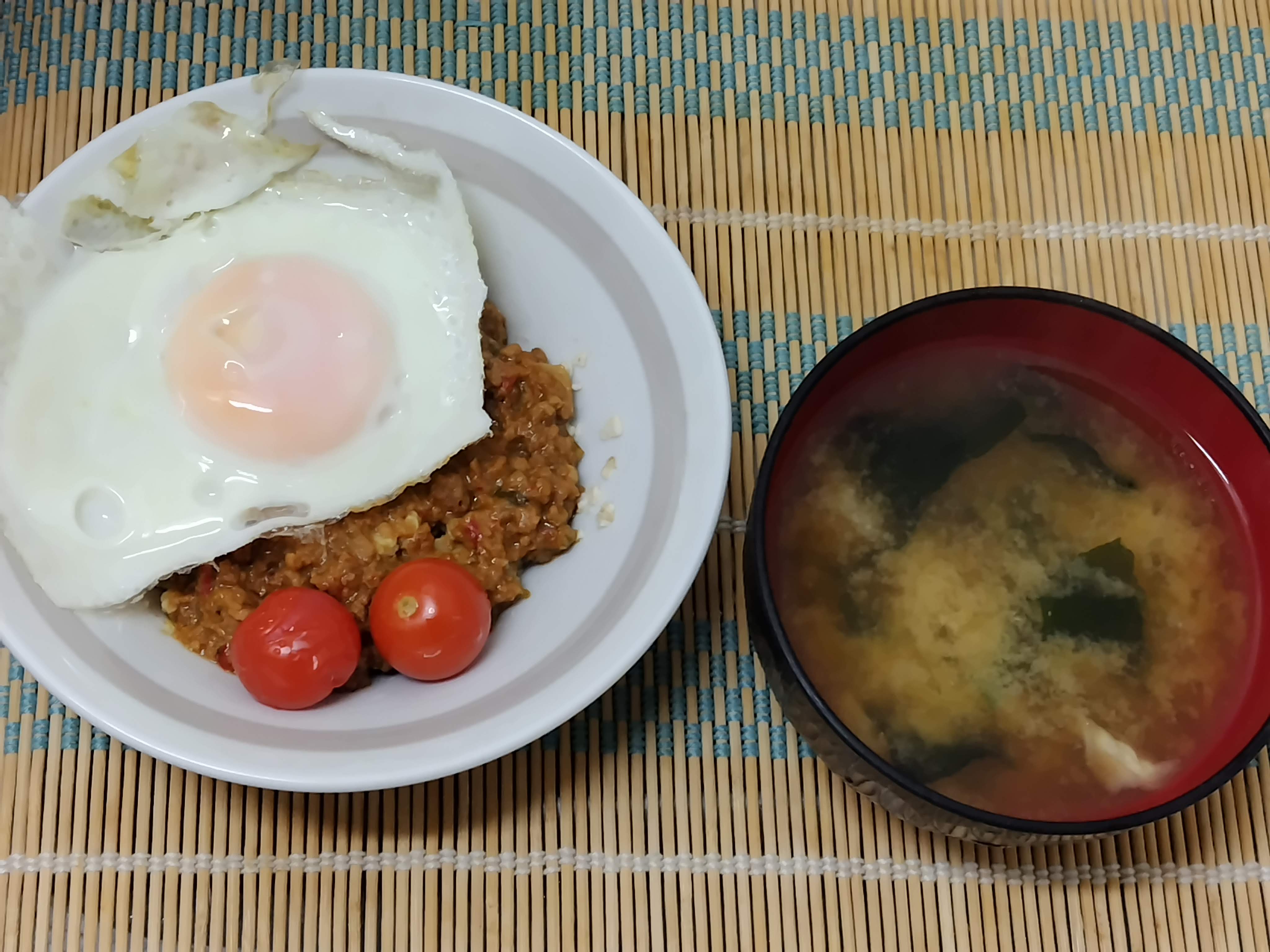 先月末に、和歌山のお土産で醤油を持って母んトコへ行った時「買ったけど味が好きじゃない」と味噌をもらい・・・なんか物々交換(私は、普段はお手軽に「液みそ」なので、固形普通の味噌を使うのは超~~久々)在宅勤務の今日のランチは、もらった味噌で乾燥野菜のお味噌汁とガパオライス(ご飯はオートミール)にしました。ガパオは、無印良品のレトルト、昨日食べた残り半分です。50歳を越えると、一般的な1食分が多く感じられること多数・・・