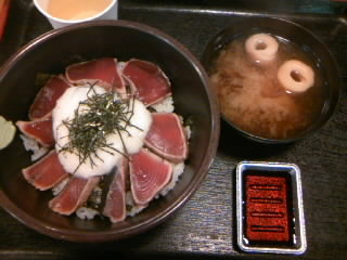 写真は「ひろめ市場」で食べた夕食「山かけタタキ丼」¥700