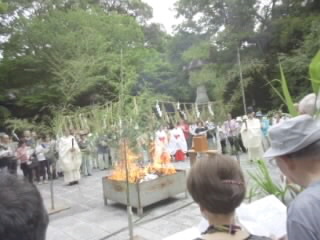 15時~の神事になんとかギリギリ間に合って、大祓詞の奏上、紙片で左右の肩を祓って、和歌を唱えながら茅の輪くぐり(神職さんに続いて参加者が長蛇の列で8の字を1回だけ)、お炊き上げ(全員で大祓詞奏上)、宮司の御言葉、という流れでした。