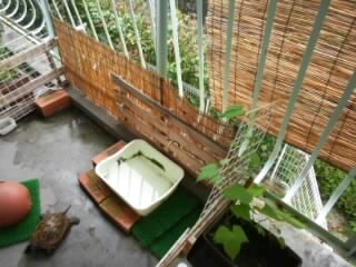 カメさんがすだれの継ぎ目の黒い結束バンドをかじろうとしてました。