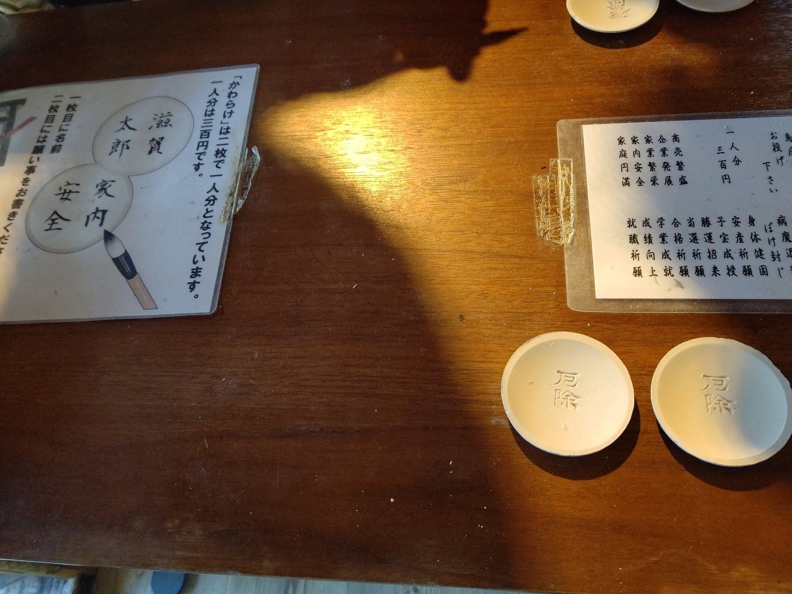 小さい瓦に、1枚は氏名、もう1枚は願い事を書いて投げます。