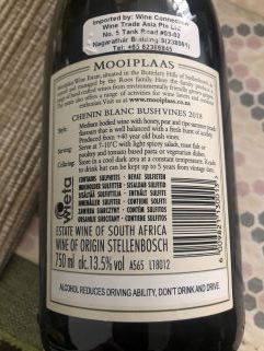 生産者名は違いますが、神の雫と同じワイン名「シュナン・ブラン・ブッシュ・ヴァインズ」とラベルにあります。裏の説明にはやはりトマトソース料理と相性が良いと書かれています。