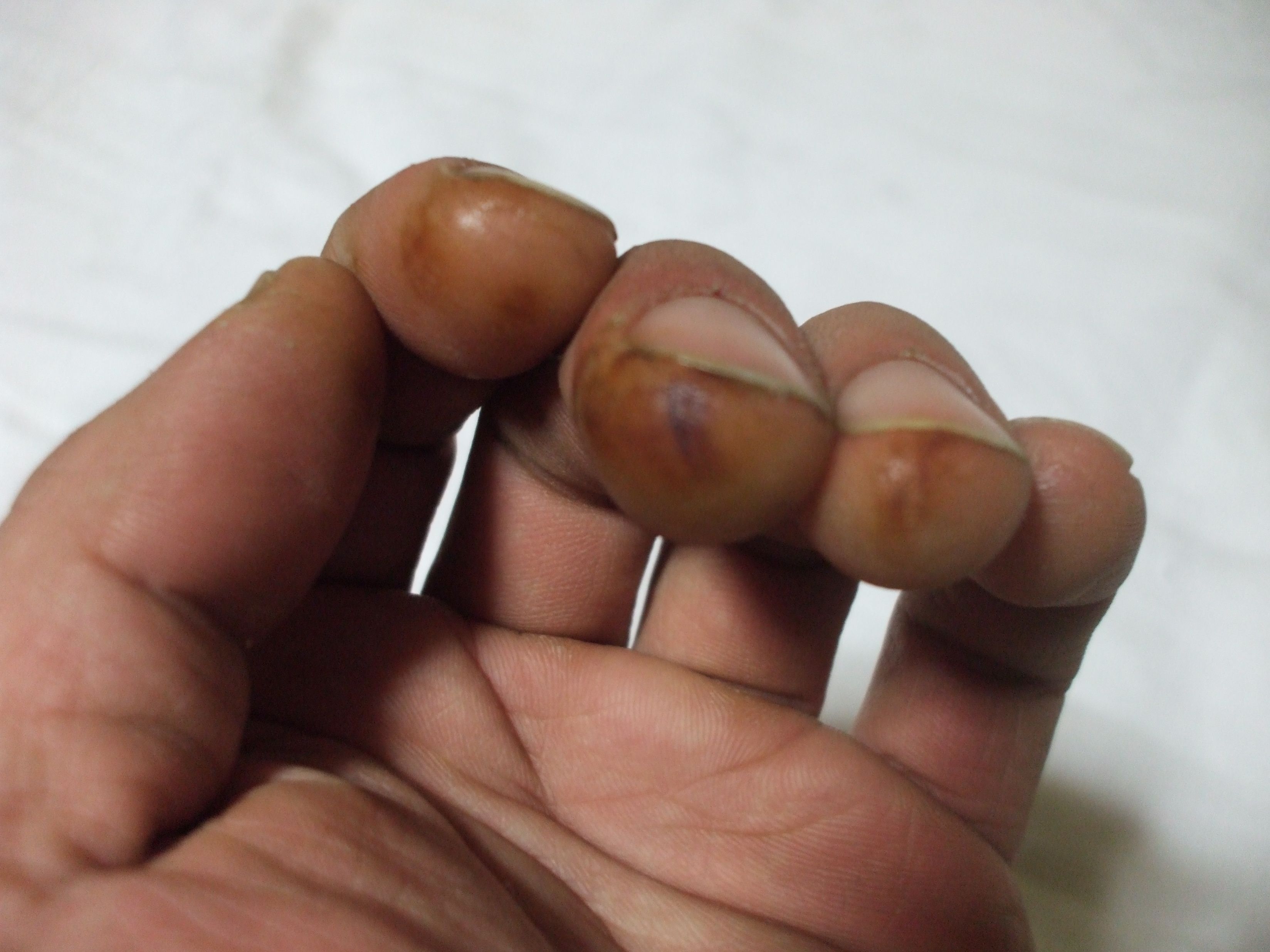 事実は小説よりも奇なり なんてことを昨日書かせて頂きました。 何があっても不思議じゃないよね、って事を言いたかっただけなのですが………当事者になってしまえば、そうはいかない。 昨日、今日と溶接が絡む仕事の進捗が悪過ぎて他の仕事に入るスケジュールが押しまくり、結果として結構な残業となってしまっていました。 一応、昨日からの遣り掛け分は今日の夕方までに終わらせることが出来、後は最終工程を明日、と言う事になってます。 で、溶接をやり終えてからふと見てみた自分の左手…あれ?もしかして…焦げてる? 溶接作業の終盤。妙に中指と薬指の先がチリチリするなぁ、とは思ってたんです。 でも、元々作業中の熱で軍手が焼けて焦げ臭い臭いと共にすぐ破けたりしていたので、その所為の火傷だろうと大して気にしていなかったのですが………。 あるもんなんですねぇ、こういうの。 テクノスクールでの実習で中々凶悪な条件での感電はしたことがありますが、流石に手が焦げた事は無かったです。 暫くはこのチリチリは続くかも知れませんね。 指先に集中するような仕事の時は要注意です(=_=)