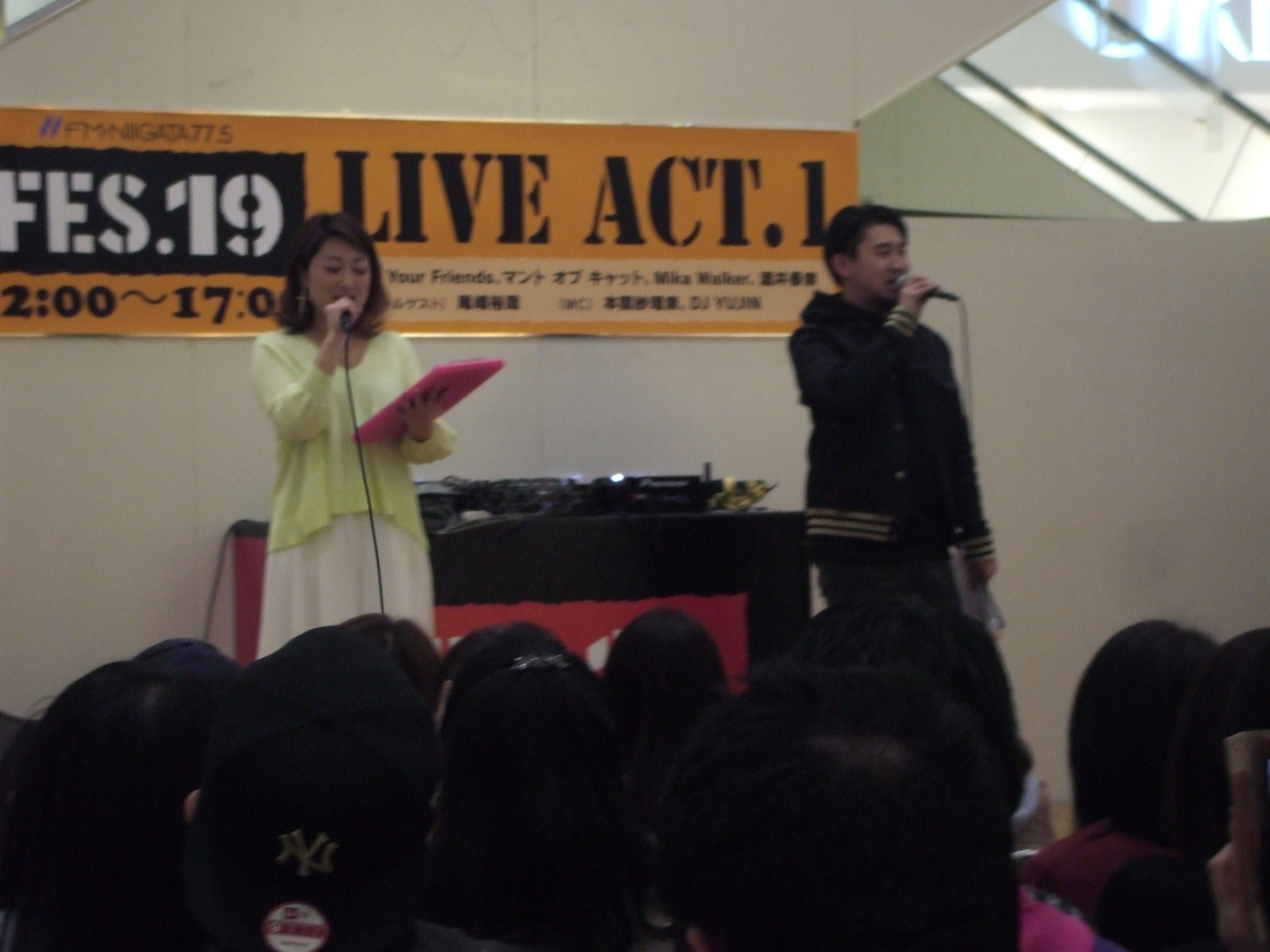 FM新潟と言うラジオ局には毎週月~木曜日の19時から2時間、日替わりでパーソナリティが喋り倒す音楽プログラム『Fes.19』と言う番組があります。 普段は新潟を拠点に活動するバンドやアーティストを中心に其々が特色のある放送をしているのですが、本日はその出演陣がラジオの枠を飛び出して、1日限りのスペシャルLIVEを開催してくれました! 久し振りのLIVE参加なのは元よりとして、普段はラジオの向こうにいる人達に会える、と言うのは無条件で気分が盛り上がりますね、やっぱ。 MCはこの2人 FM新潟パーソナリティの本間紗理奈嬢と多分日本一多忙のクラブDJ・DJ YUJIN。 この2人のMCトークに続いて登場したのが 本人曰くところの「新潟とイギリスのハーフ」ミカ・ウォーカー嬢。 ソロシンガーだけでなく、バンドのヴォーカリストやモデルなんかもやってます。 パワフルな歌声とはっちゃけたキャラが可愛いです。 続いて登場したのが、新潟の誇るもう1人の歌姫 酒井春奈嬢。 番組でMCを勤めると共にシンガーソングライターでもあり、言語聴覚士の資格もあり、最近はウェディングドレスかなんかのモデルもやってるんだとか……(;゚Д゚) 透き通るのびやかな高音が魅力的な歌声でした。 今のところイベント会場でしかCDが買えない、と言う事で1も2も無く買いましたよ! 現在、スーパーヘビロテ中です。 でもって春奈嬢のお次は マント・オブ・キャットのお3方。 ………実は当方、バンドの存在は知っていても3人組だったのを今日初めて知りました(-_-;) 漫才っぽく、だけど真面目なラップナンバー。古き良き名曲『3年目の浮気』マント・オブ・キャットVer、凄く楽しかったです。 そしてHilcrhymeの正統後輩(?)YOUR FRIENDS。 麒麟山のCMでよく観ますかね。この2人も生で歌声を聞くのは初めてでした。 そして、本日のスペシャルゲスト! 尾崎裕哉氏!………いや、本当にスペシャルなんですけど!? 1週間後に新潟LOTSでもライブだったり、その前の水曜日には初のCDが出ると言うけれど!! 何が如何なって、今回来てくれたんだろう…? 親父さんの名曲『I LOVE YOU』を歌って魅せてくれましたよ! 他にもオリジナル曲を披露してくれたり、先のユージンや紗理奈嬢のスペシャル対談では中々興味深い話をしてくれたり………。 めっちゃ良い人でした。 去年くらいに初めて耳にしてからずっと欲しかった酒井春奈嬢のCDは今回、まさかの本人の手渡し&サイン付きでGET! 嬉し過ぎでした。 他にもマント・オブ・キャットは4月の何処か、ユアフレンズは5月3日にそれぞれアルバムを出すそうで、また2つほど楽しみが増えました。 FM新潟の企画陣さん、スタッフの皆さん、今日の出演者の皆さん…… いつも以上に最高の時間を有り難うございました!!
