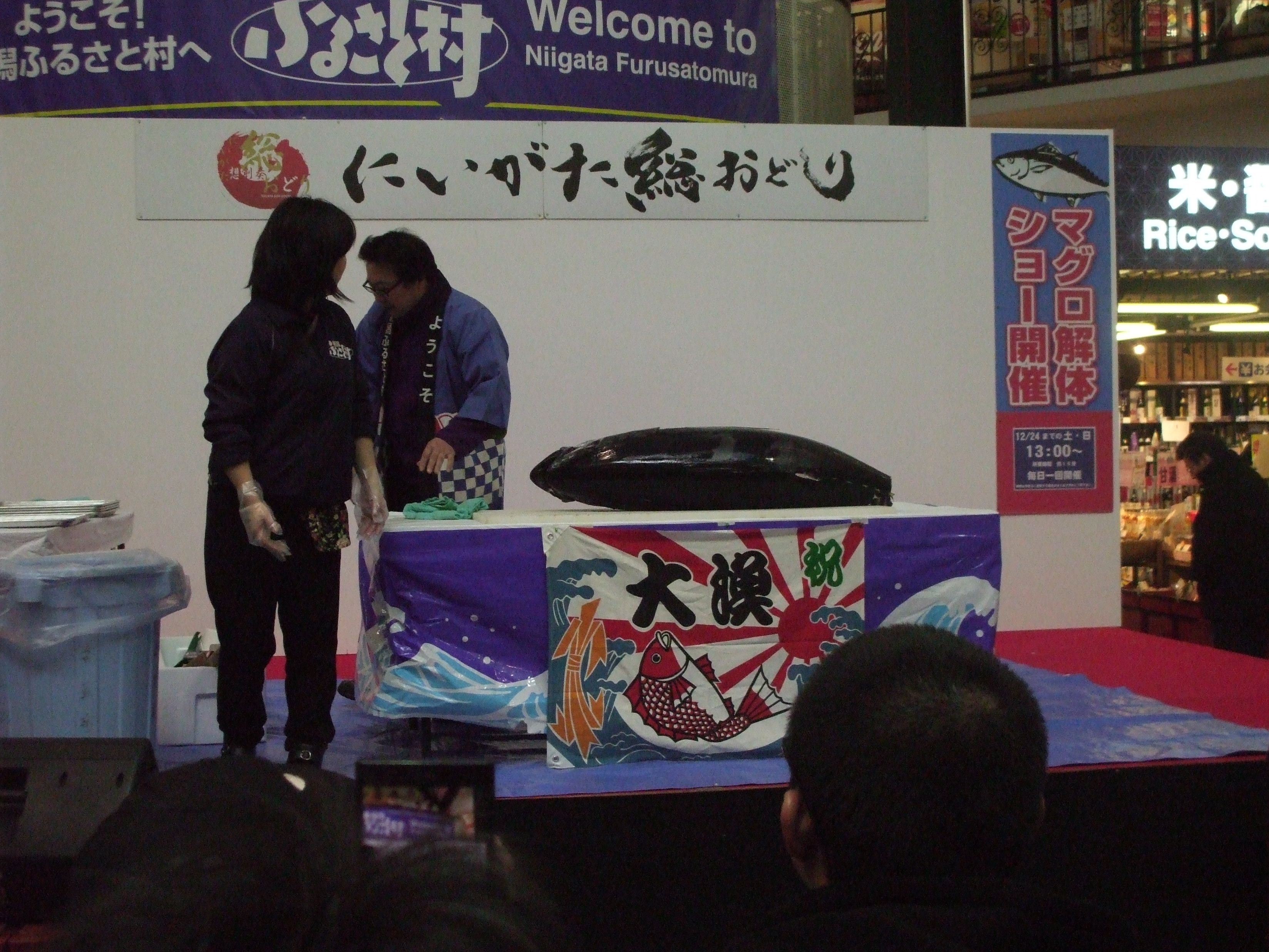 魚が有る、と掛けまして 「マグロ」と解きます その心は お寿司屋さんに訊いてみよー! と、言う事で行ってきましたよ。 新潟ふるさと村で年明けまで開催予定のアレに! 幸運にも直ぐ近くまで行くことが出来ました! 台上のマグロはメバチマグロで45㎏ほどの重量が有るそうです。…………見た感じよりも随分重いっすね。 それを順に捌いていく訳なんですが、通常の魚とは違うらしいですよ。 先ずは胸鰭を落として、頭から 興味深かったのは頭を落とすために背骨を切る訳ですが、その時の包丁が鋸にしか見えないものだった事。…………と言うか、鋸だと説明されていました。 そして、次は胴体部分を其々背中側を2つ、腹側を2つに中落を1つの合計5つに落とします。 そう。つまりは5枚におろすのがマグロ式、と言う事なんだそうで。 パフォーマンスそのものは20分弱くらい。 30分を予定していたところをサクサクと進めていました。 パフォーマンス終了後にステージに近寄って包丁を改めて見させて貰いました。 ……………如何贔屓目に見ても日本刀にしか見えないんですけどね、包丁なんだそうです。 そう言えば、自分の勤め先の近くに在る(らしい)刃物メーカーさんで同じような包丁を作っていたような気がしますが……………。 解体したマグロはそのまま会場内のブースで美味しく頂きましたよ。 昼間っからマグロの赤身を頂ける………。 豪勢な休日もあったもんです。この上、ふるさと村まで車で行っていなければお酒も飲めていたんですが…………そこまで望んではいけませんね。 新潟ふるさと村の海鮮祭りは年明け3日までやってま~す!