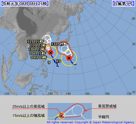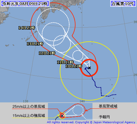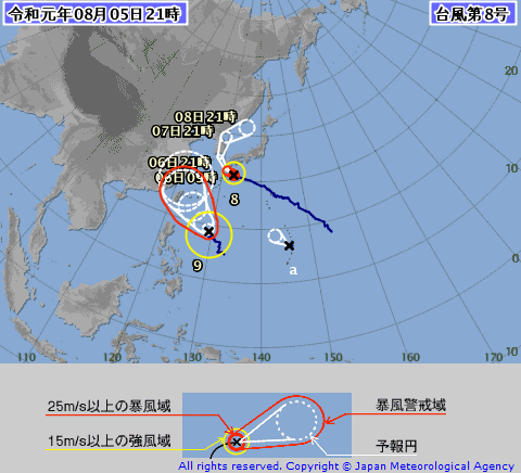 年台風3つ子衆………… まぁ、なるべくしてなった感があるけれど………。 願わくば北西へ急角度で転回して貰いたいところでもある。これ以上接近する前に勢力ダウン→消滅してくれればもっと良いです………。 今のところ上陸中の8号はともかく9号10号は北西へ針路をとるのではないか、と予想されていますが………この2つ、距離が近いんですよねぇ…………。 もし、相互干渉が有るなら現時点での予想なんか良くて希望的観測にしかなりません。 さすがに合体するようなことは無かろうと思いますが………互いの回転と地球の自転の影響で如何進行してくるのかが読み難くなるのは確かだと思うんですよね。 現に予報円がずいぶん大きく取られてますしね。 となると懸念されるはフェーン現象 では無く、お盆連休への影響ですよね。 どう出るか、と言うのは勿論、現在計画していることと立てた目的を憂いなく遂行出来るか………が懸念される訳ですね。実際、去年は1つそれで断念したことが有りましたから。 直近ではフェーン現象も気掛かりなんですけど………もう少し先にある「働くための目的」を動かせるか、と言うのも大きな問題ですからねぇ。 さて、如何なる事やら…………。