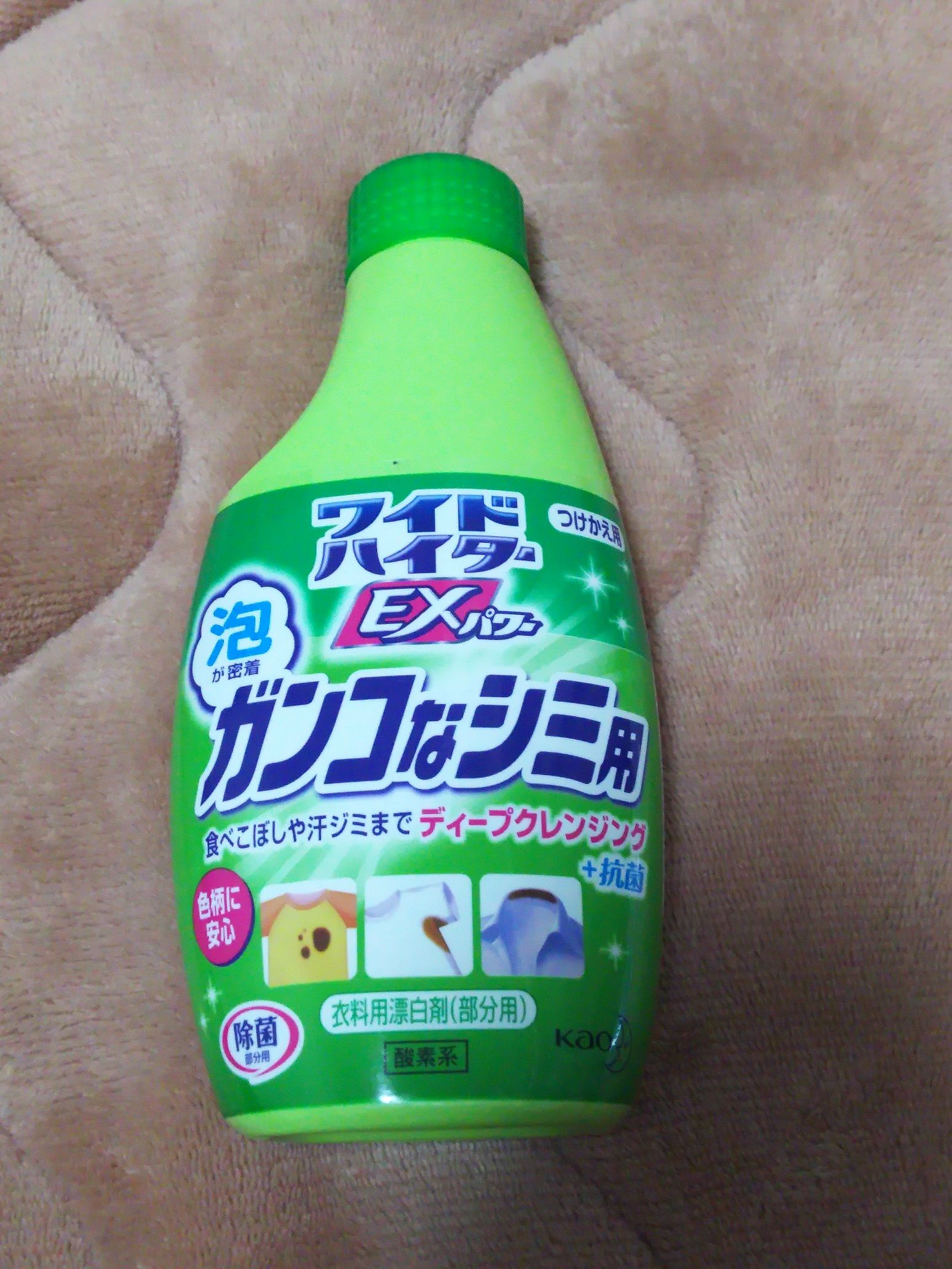 長袖のこの時期は汗もかくので袖口と襟足が汚れます。帰宅後先ず汚れた個所にひと吹きかけて週末にまとめ洗いします。だいたいこれで汚れやシミが落ちます。一度色物で色がまだらになったので漂白作用が強いのでものによっては注意が必要です。ワイドハイター EXパワー 漂白剤 ガンコなシミ用 付け替え(300ml)【ハイター】