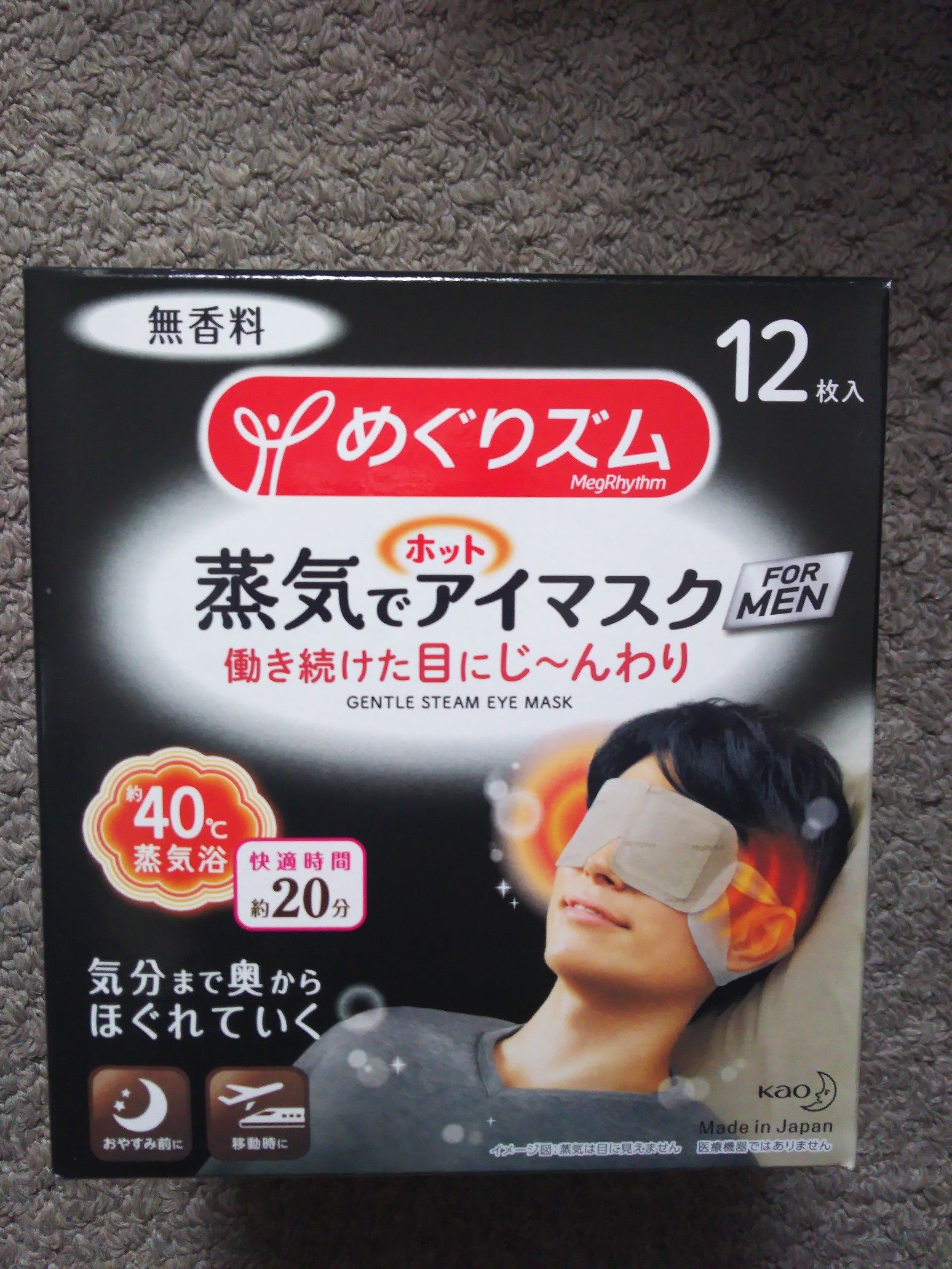 ほんのり温かいアイマスクです。パソコンやスマホで目がかなり疲れますので、アイマスクで目の疲れを取ります。昼寝の際も目隠しになるのでよく眠れます。目の疲れが回復します