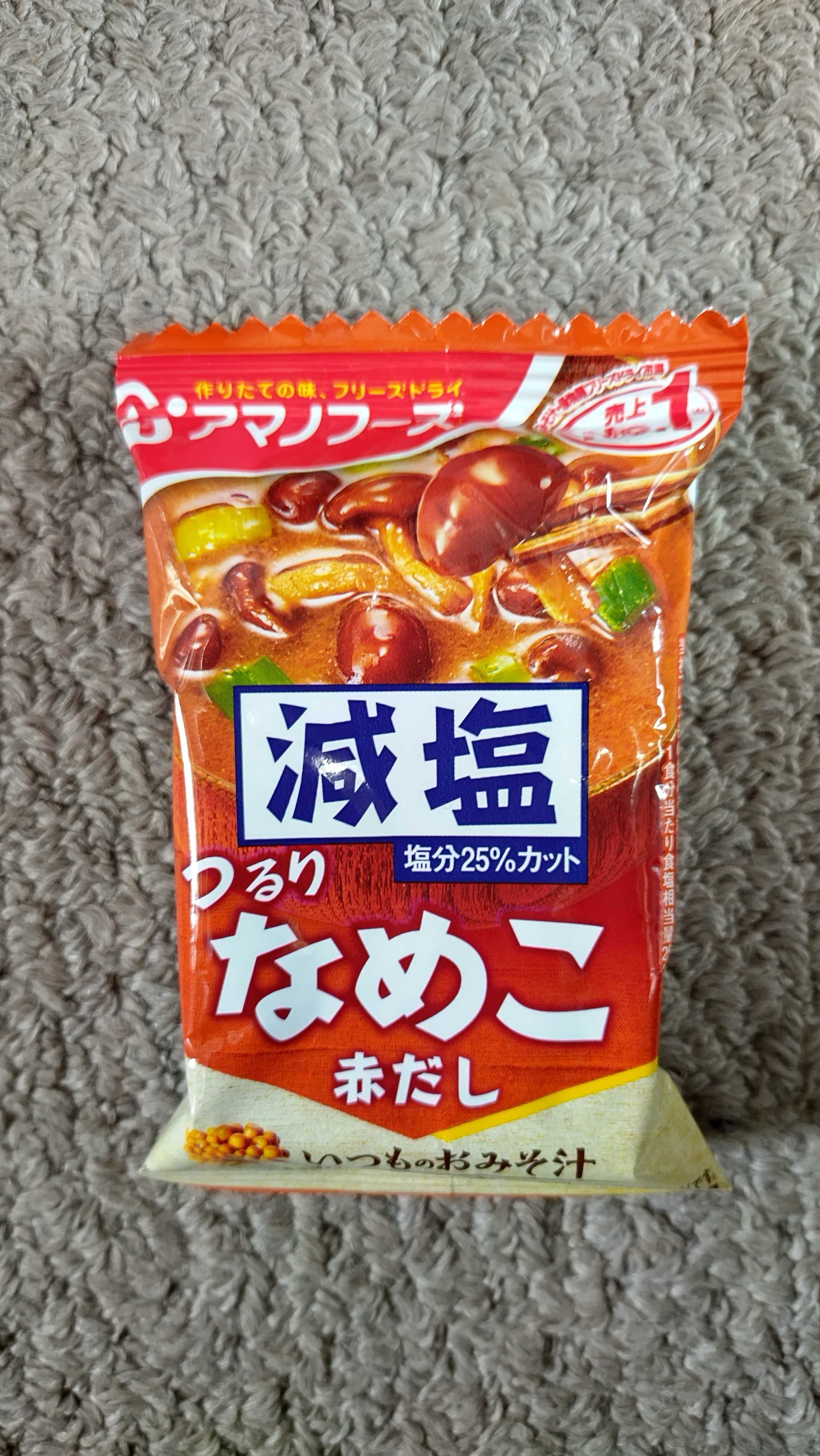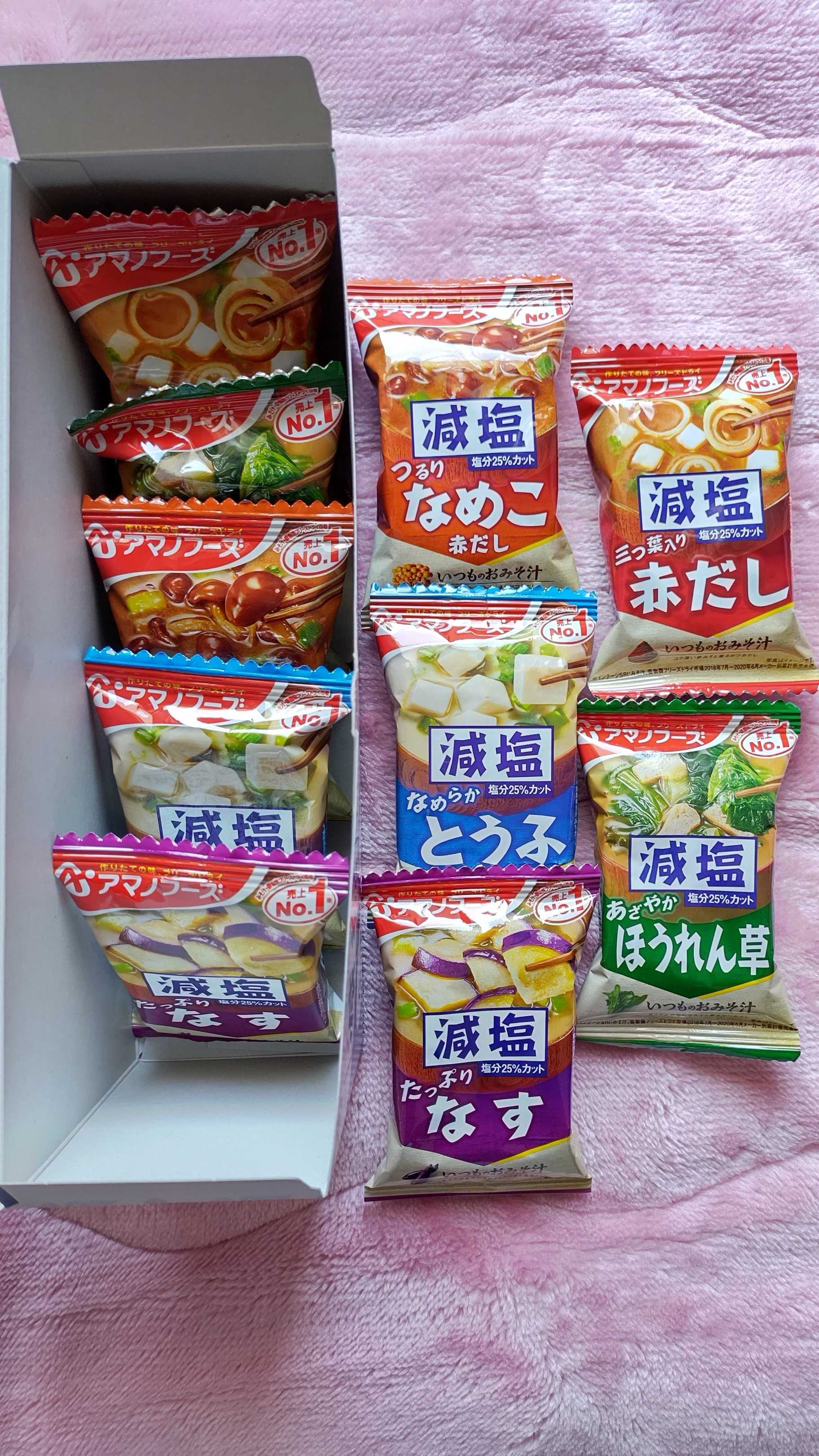 こちらは、豆腐、なめこ、ホウレンソウに、ナス、赤だしが入って5種類10個入っています。どれも減塩ですが、とても美味しいので気に入っています。大好きな赤だしの味が減塩で食べられるのは有難いです。