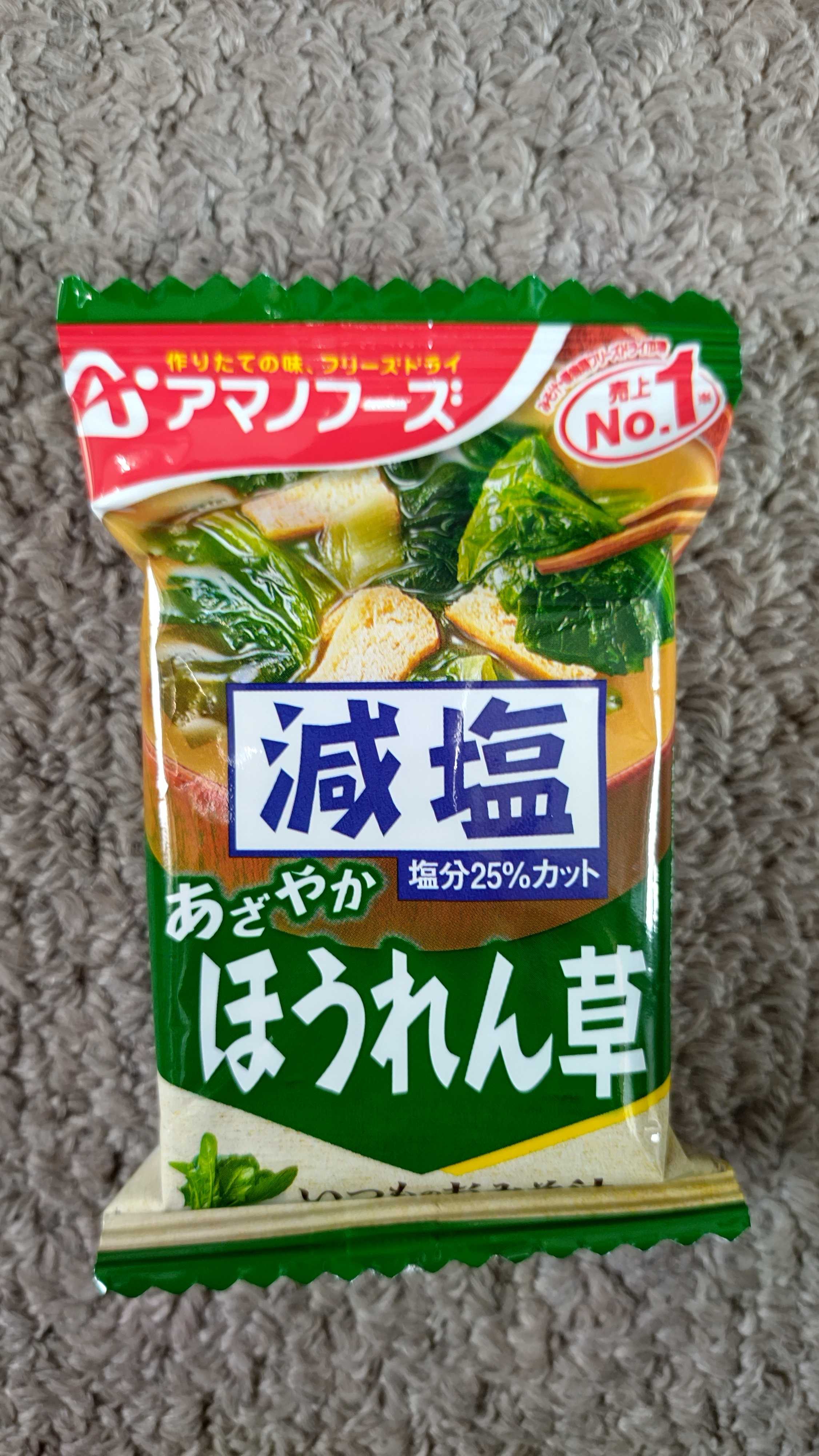 ほうれん草の味噌汁は我が家では人気の一品ですが、若干値段が高いようですが、減塩でしっかりほうれん草が復活するので、フリーズドライの技術に関心する商品です。