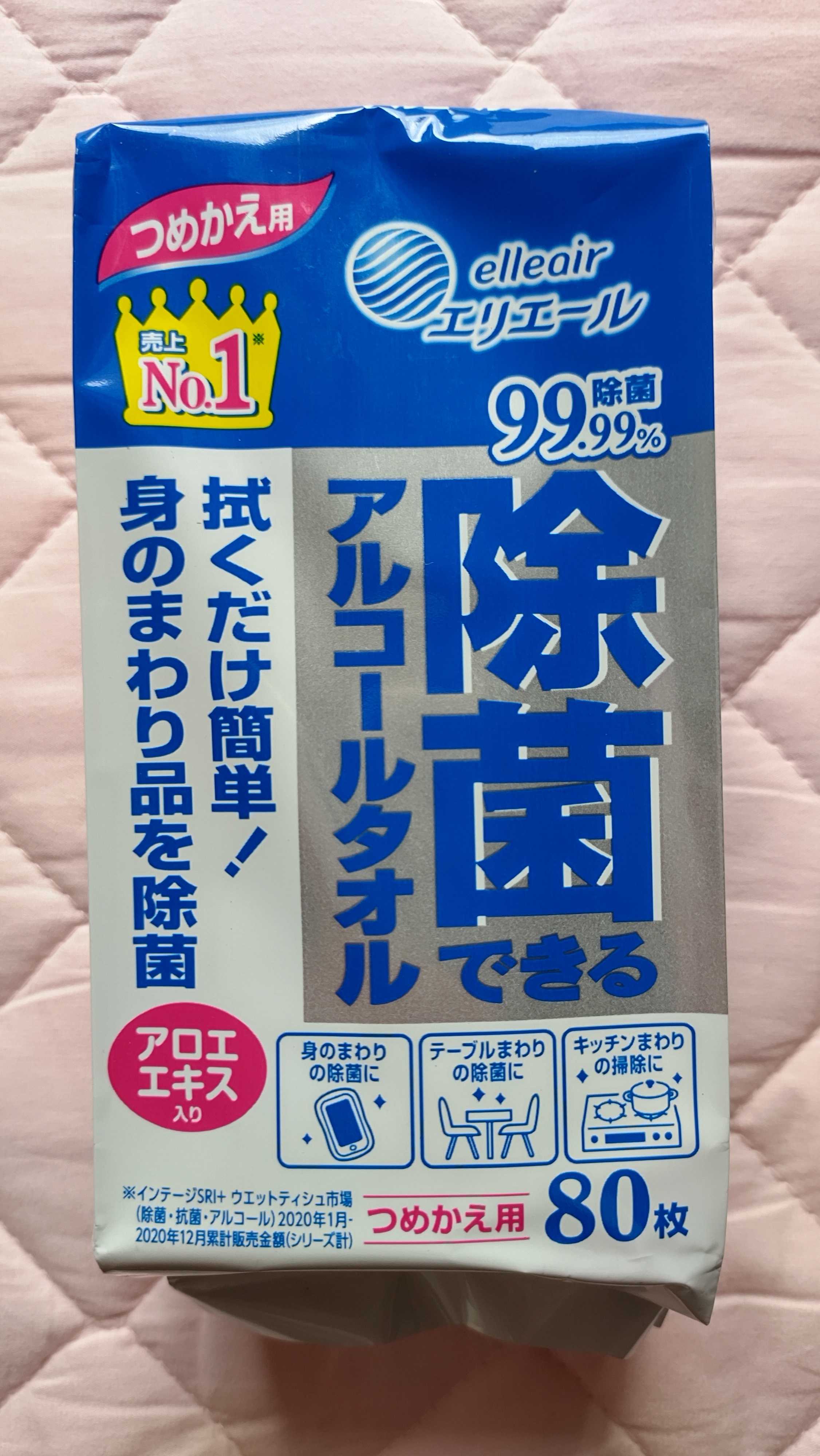 こちらは詰め替え用です。開封して専用容器に入れて、頭のキャップを開けて取り出すタイプです。主に食卓まわりに使いますが、パソコン、マウスなど様々なものを拭いています。アロエエキスが入っているので保湿や香りの役目でしょうか。