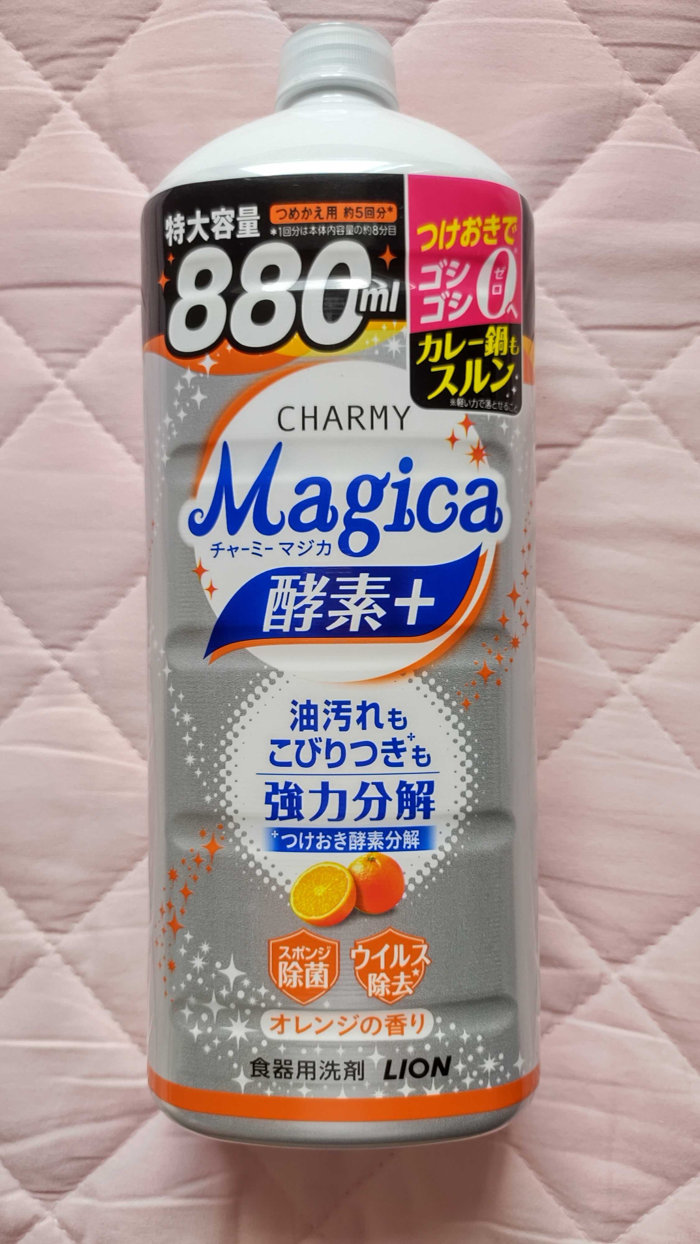 チャーミーマジカのオレンジの香りが気に入っているので使っています。手荒れが少ないのと汚れ落ちが良く、除菌もしてくれるのでありがたいです。我が家ではこれ一本で2から3か月は持つ感じです。