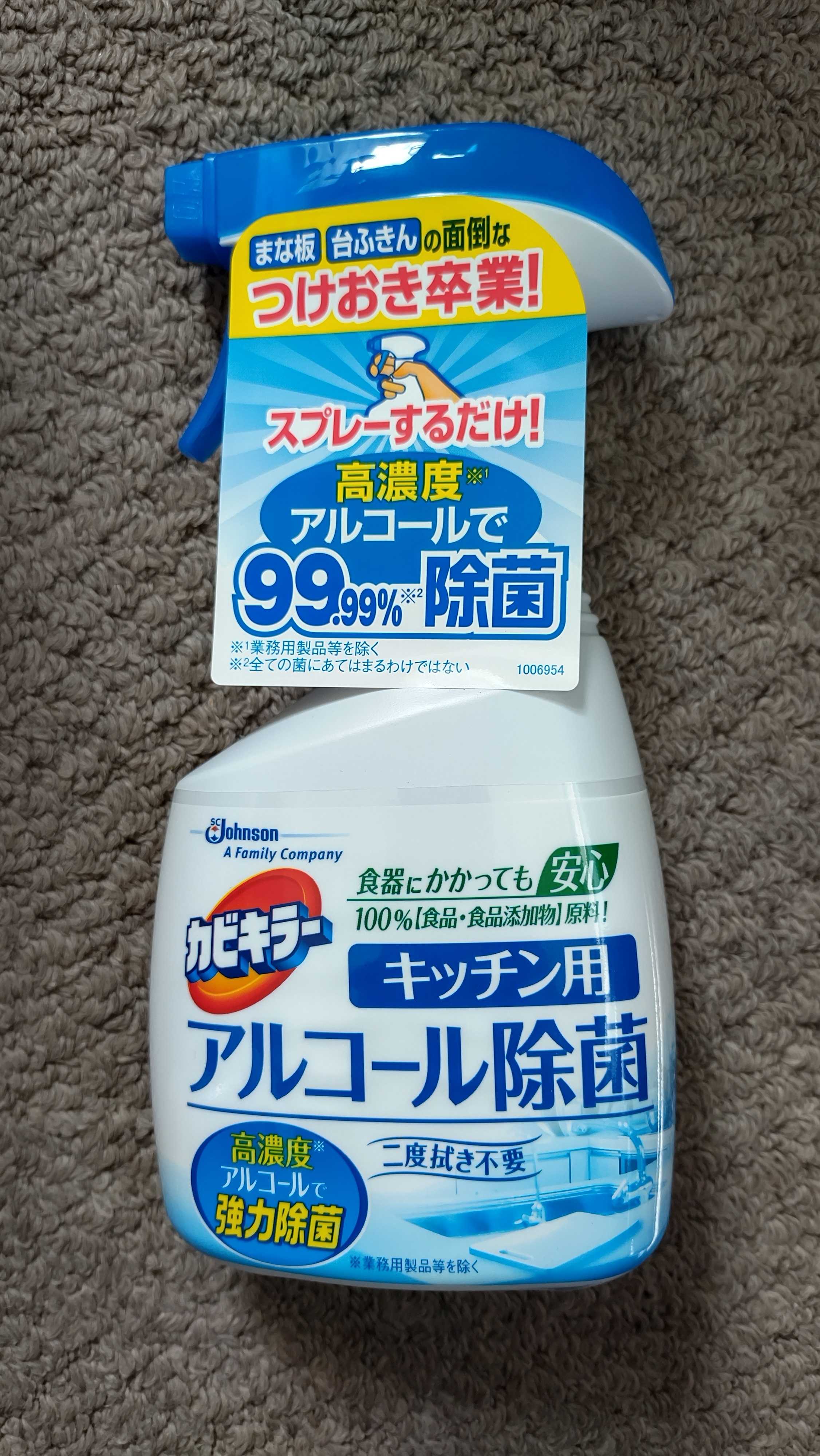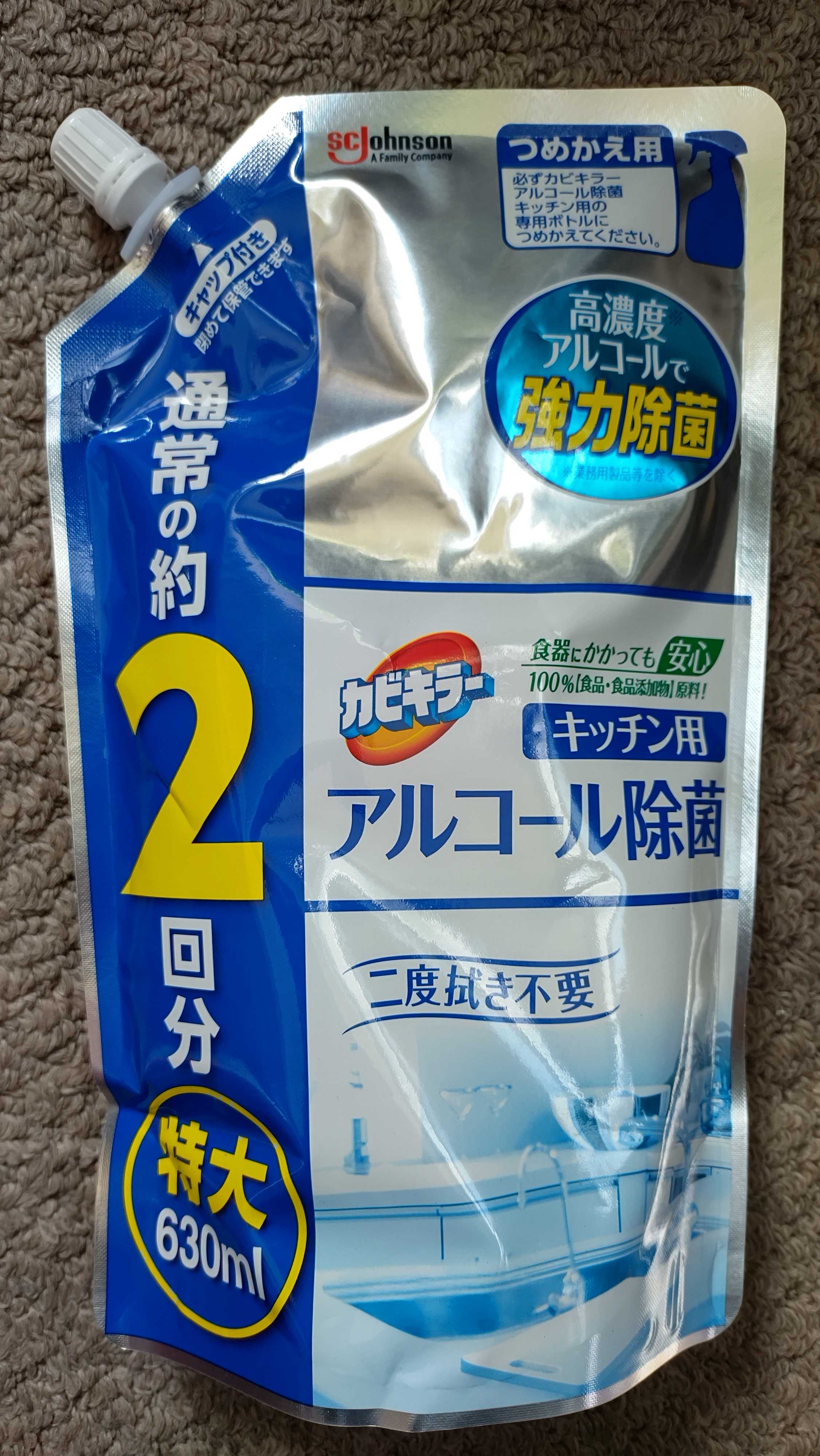 除菌アルコールの詰め替え用です。キッチン周りだけでなく、玄関周辺も除菌しています。キッチンで使えるものですので、いろいろなところで使えます。インフルエンザやコロナなど、まだまだ必要そうです。