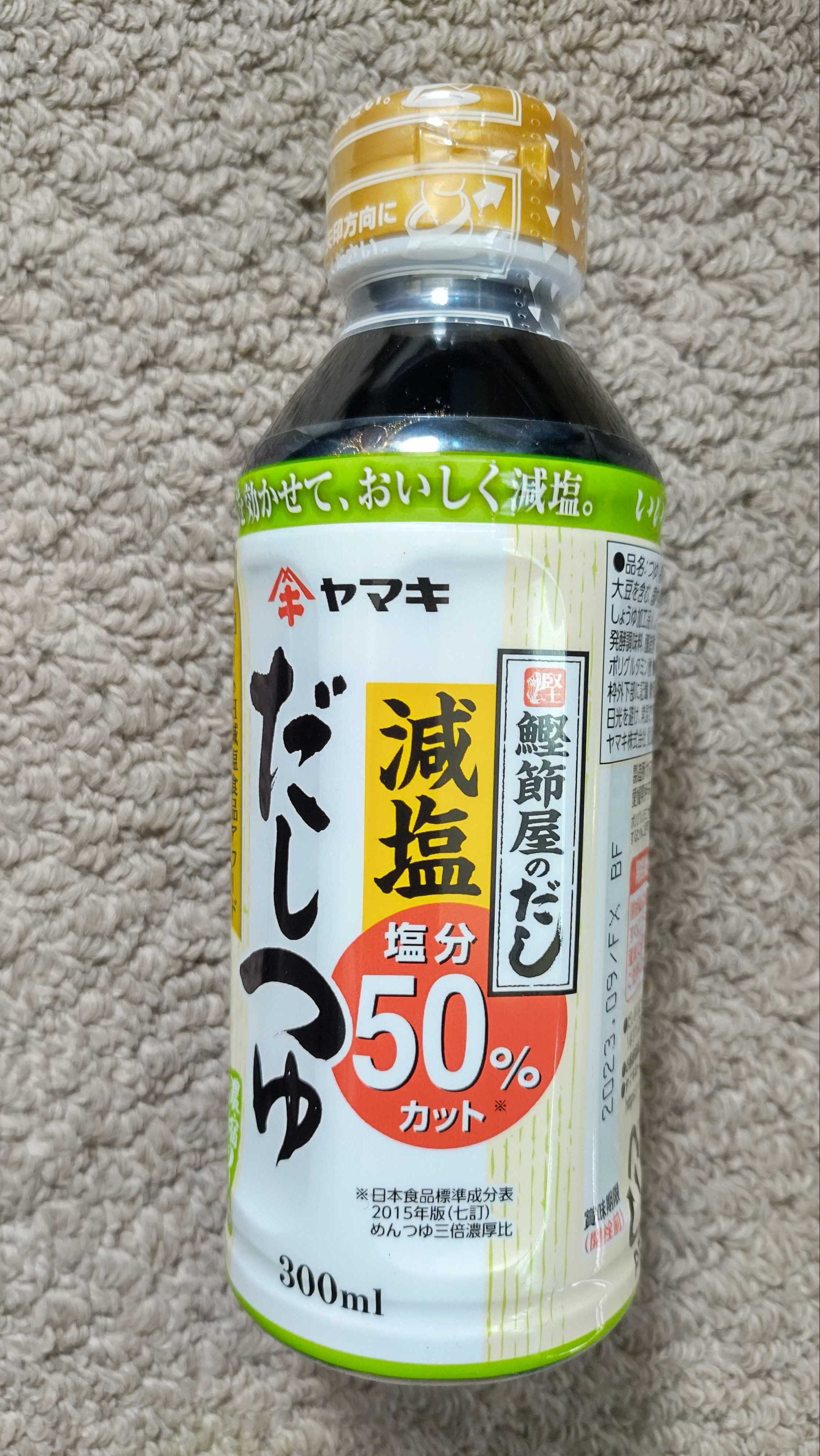 ヤマキの減塩出汁つゆ300mlです。減塩ですが出汁が美味しくこの味に慣れました。我が家では300mlの量も開封後、酸化しない程度で使い切れる量なのでちょうどよいです。