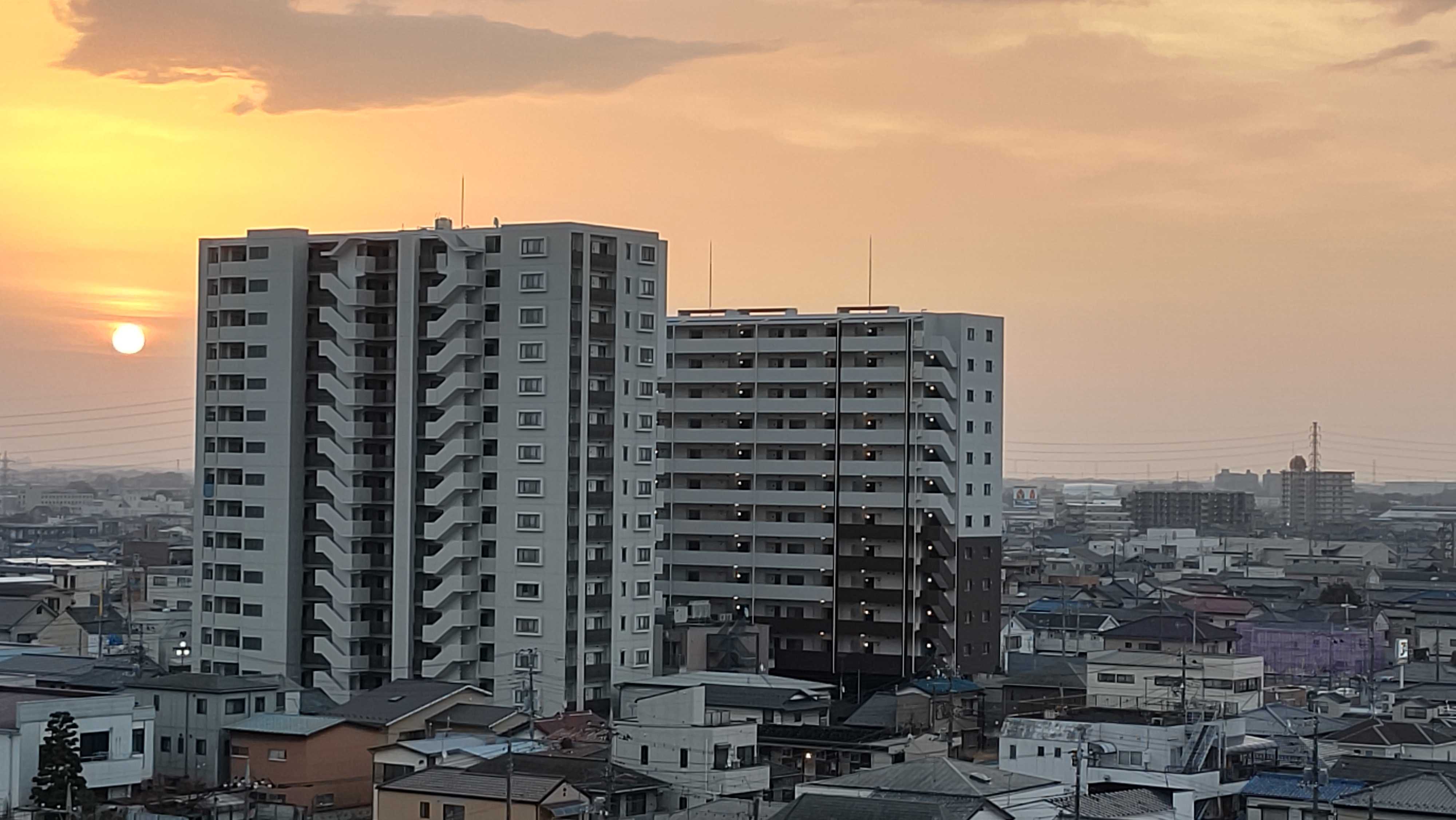 朝日ちょうど見えたので写しました。日の出の位置はかなり変わっています。 ↑ この建物の右側が元旦の日の出の位置元旦の日の出