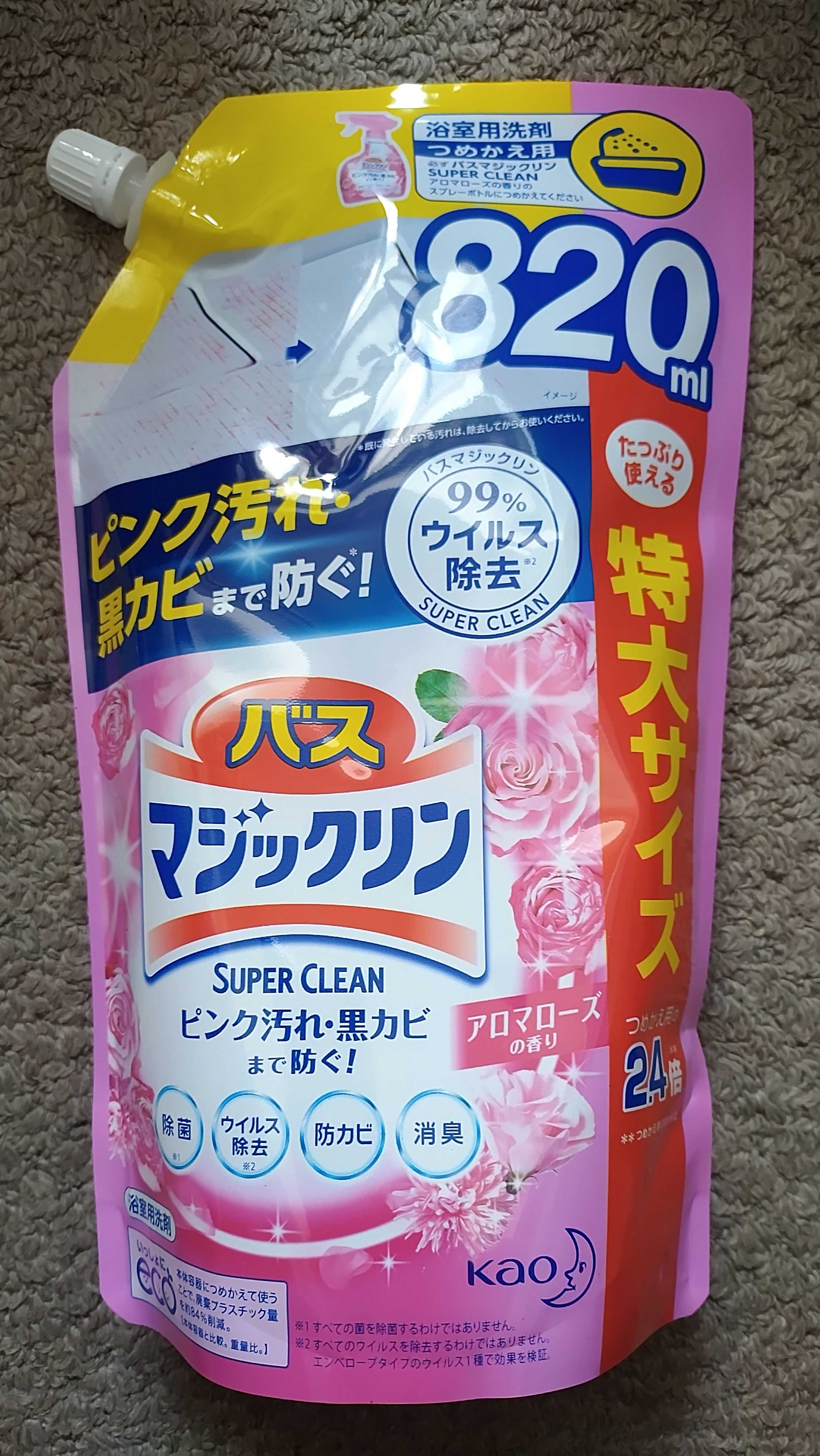バスタブクレンジングはお風呂のお湯を抜くときに一吹きしますが、バスマジックリンはお湯を入れる前に洗う洗剤です。どちらか一方で良いと思ったのですが、両方やった方が気持ちよく入れます。手間がかかりますが・・・